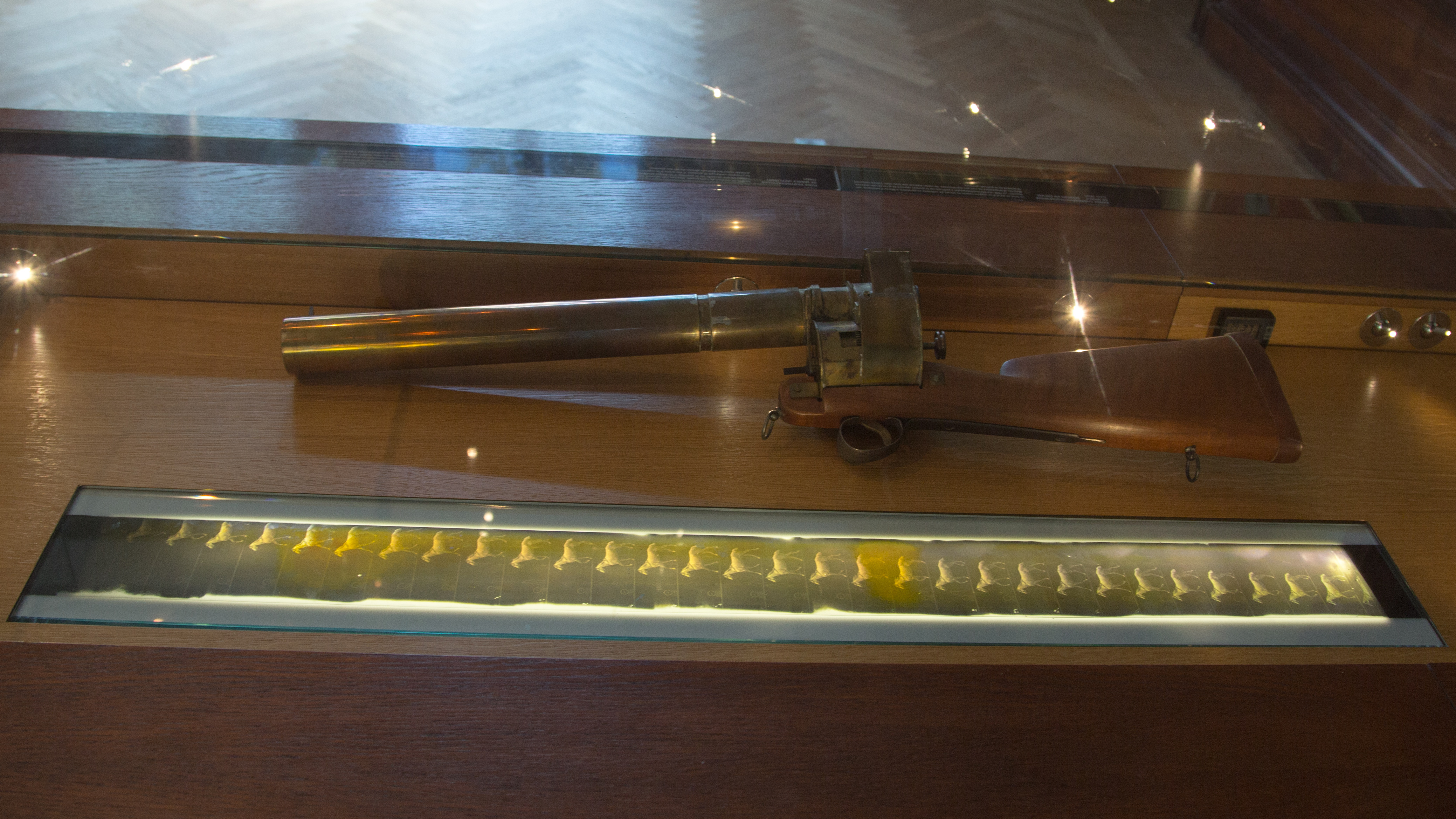 1882년, 에티엔-줄 마레이는 크로노사진 총을 발명했다. 이 장치는 초당 12개의 이미지를 촬영할 수 있었고, 금속 셔터를 사용하여 움직이는 이미지를 포착했다.[5]