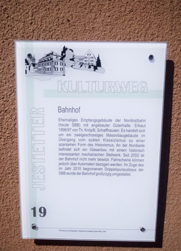 역사의 구 대합실은 1896년부터 1897년까지 스위스 북동부 철도에서 의뢰하여 샤프하우젠의 Th. Knöpfli에서 건설하였다. 후기 고전주의 양식으로 건설된 2층 규모의 건물이다. 대합실 북쪽에는 1914년에 설치되어 과거에 사용된 Bruchsal J형 기계식 신호소가 보존되어 있다.