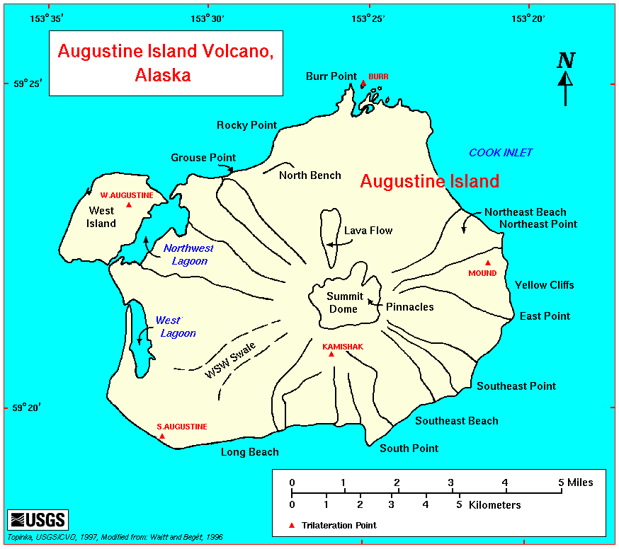 오거스틴 산은 알래스카 남부 쿡 만에 위치한 섬 화산으로, 복합 성층화산이며 안산암질 암석이 주를 이룬다. 1976년과 1986년, 1994년 분화가 있었으며, 2005년부터 2006년까지 분화하여 앵커리지 지역에 화산재를 발생시켰다. 알래스카 화산 관측소(AVO)는 지진계, GPS, 경사계, 웹캠 등 다양한 센서 네트워크를 활용하여 화산 활동을 감시하고 있다.