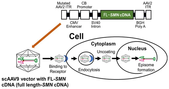 오나셈노진 아베파르보벡은 척수성 근위축증(SMA)의 근본 원인인 ''SMN1'' 유전자 돌연변이를 해결하기 위해 개발된 생물의약품이다. 이 약물은 AAV9 바이러스 캡시드를 운반체로 사용하여, 합성 프로모터와 함께 정상적인 ''SMN1'' 전이 유전자를 포함하고 있다.[4]