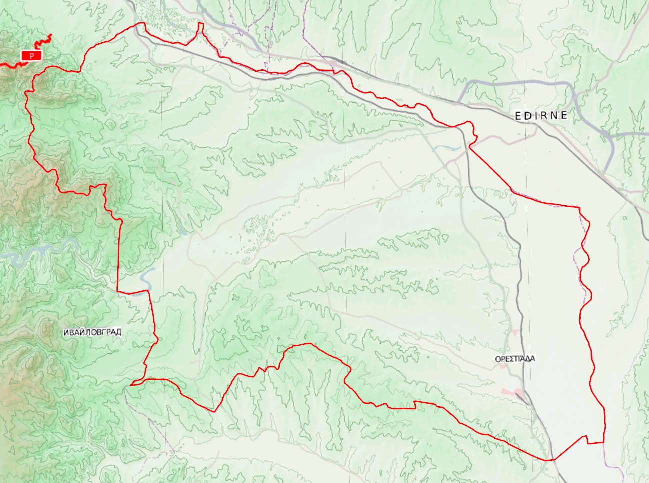 오레스티아다는 해발 40m 지점의 에브로스 강 평원에 자리 잡고 있다. 그리스와 터키 사이의 자연 경계를 이루는 에브로스 강둑에서 서쪽으로 불과 6km 떨어져 있다. 디디모티호에서 북쪽으로 17km, 에디르네에서 남쪽으로 19km, 그리스-터키-불가리아 삼각점에서 남동쪽으로 28km, 스빌렌그라드에서 남동쪽으로 40km, 알렉산드로폴리에서 북동쪽으로 91km, 이스탄불에서 서쪽으로 212km 떨어져 있다.