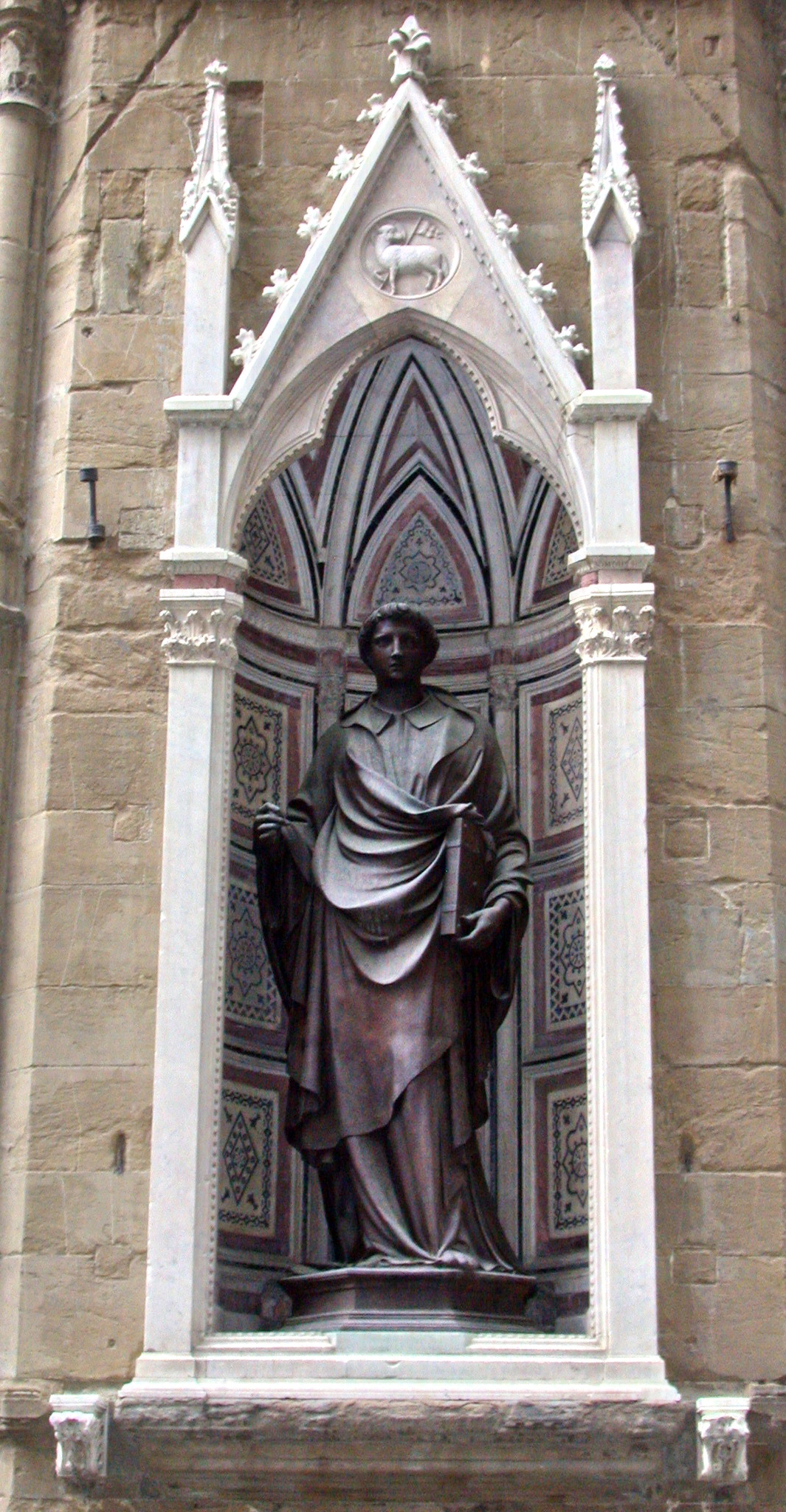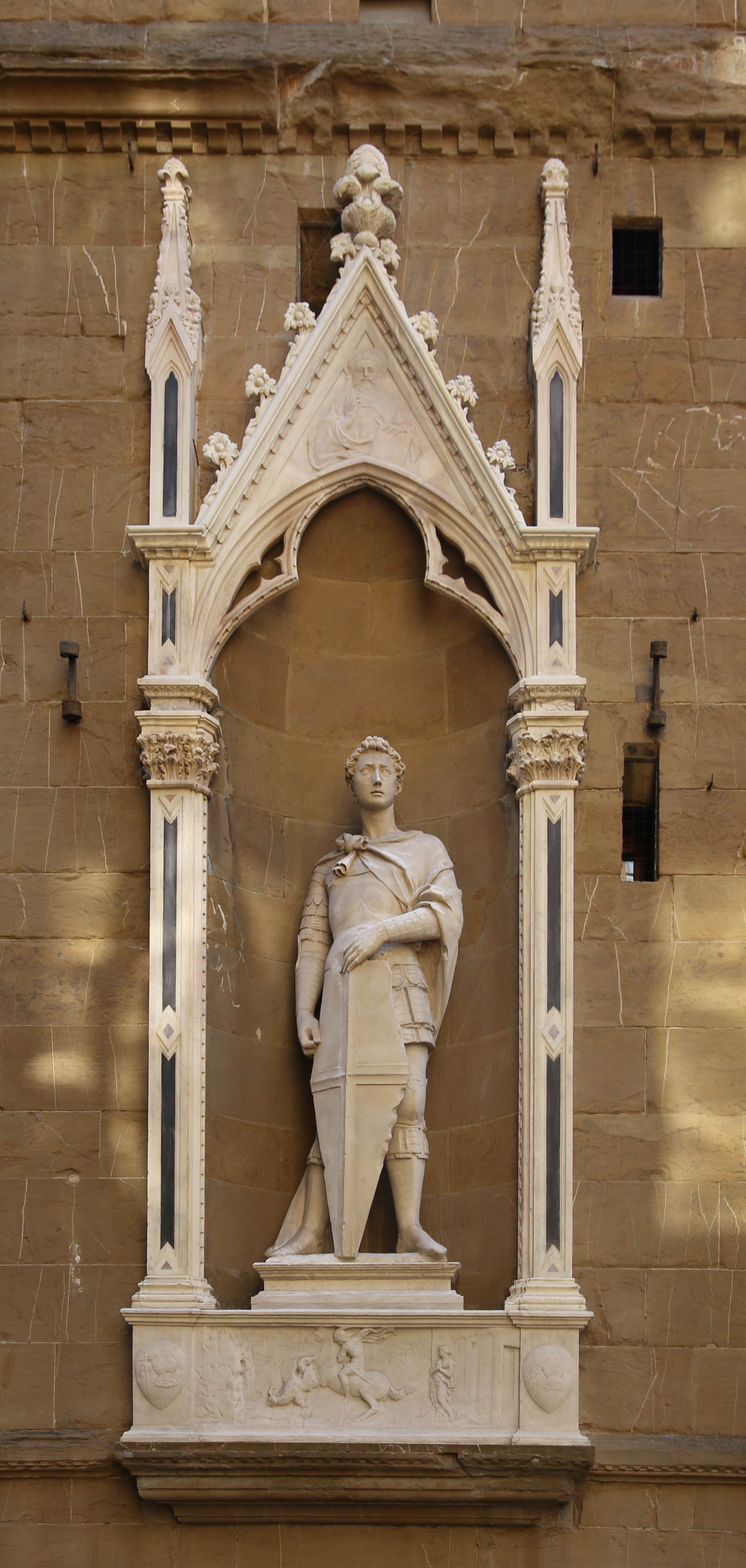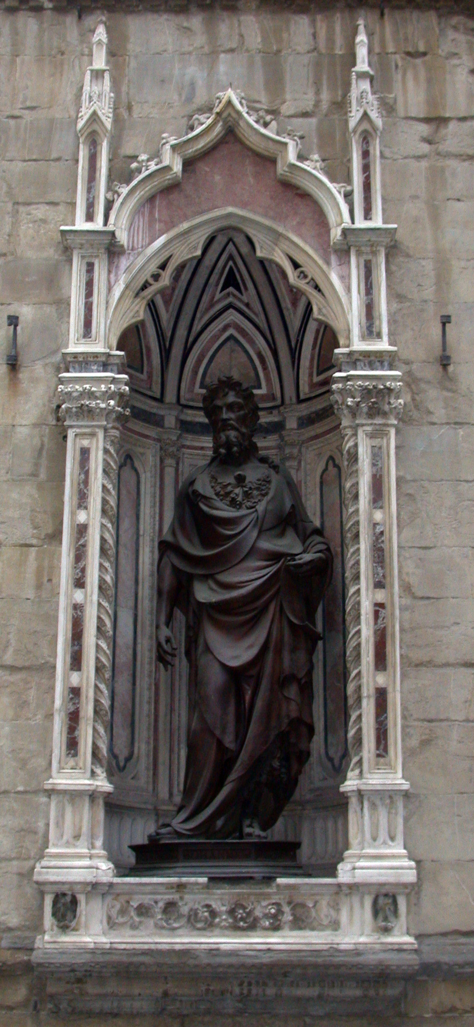14세기 말부터 15세기 초, 피렌체의 주요 길드들은 오르산미켈레 외부 벽감에 자신들의 수호성인 조각상을 봉헌했다. 이 조각상들은 1399년부터 1430년경까지 채워졌다.[30] 특히, 가장 부유했던 세 길드는 자신들의 수호성인 조각상을 석재보다 약 10배 비싼 청동으로 제작하도록 의뢰했다.[30]조각상 | 조각가 | 의뢰 길드 | 년도 |