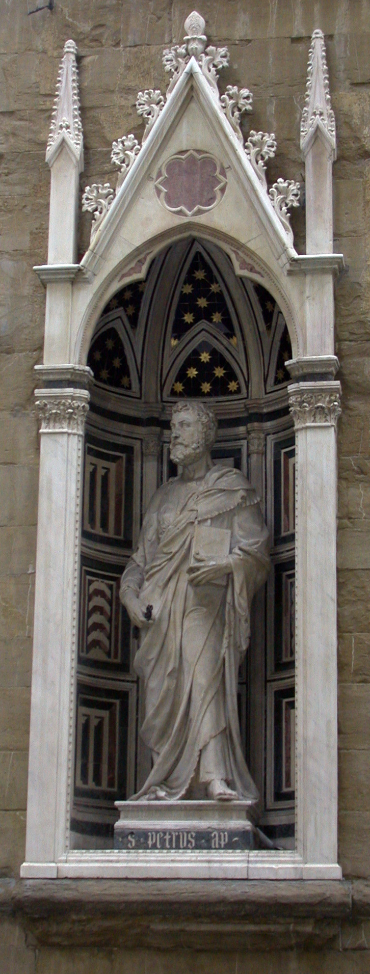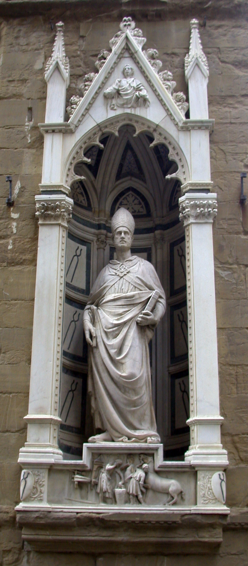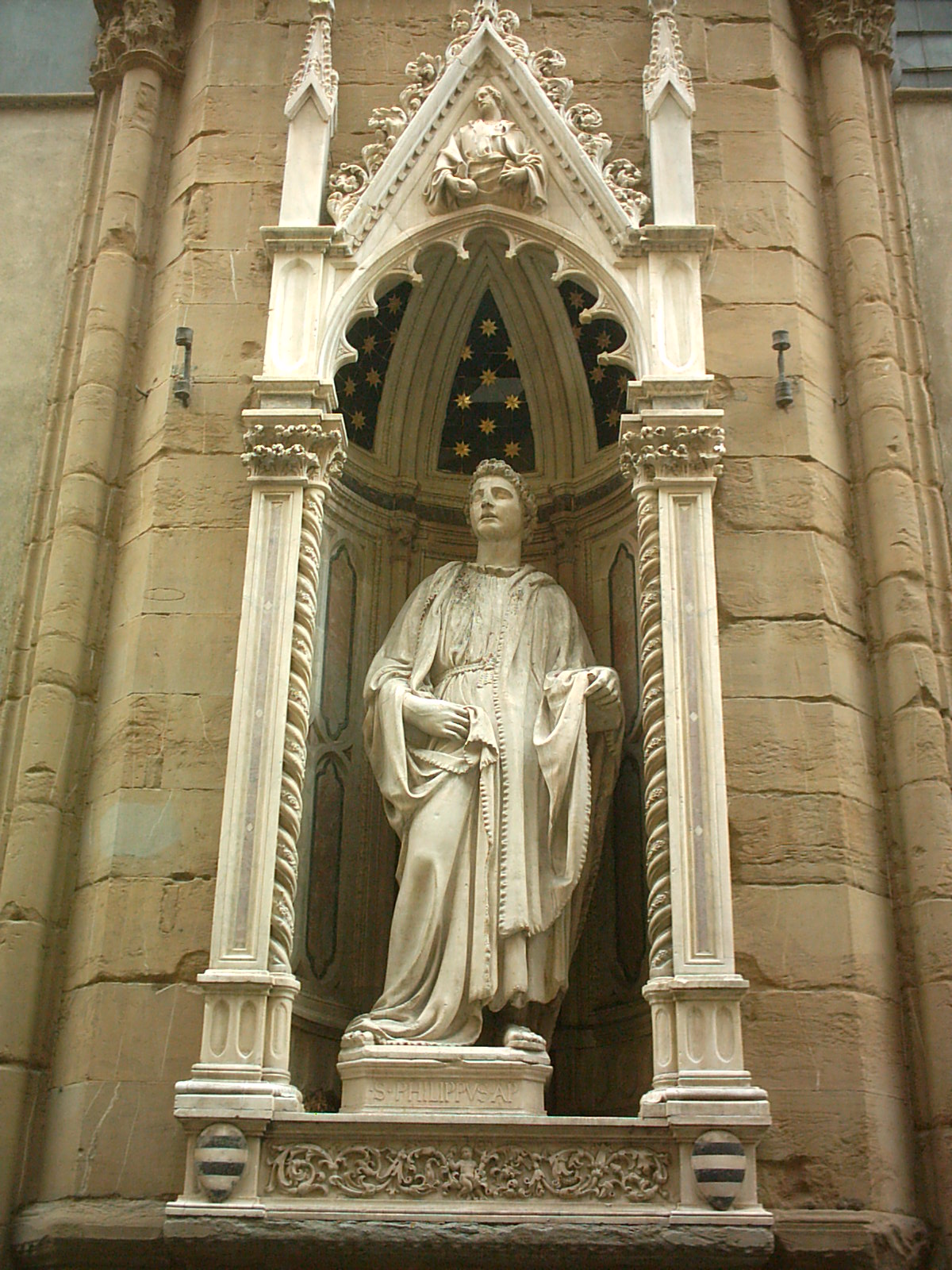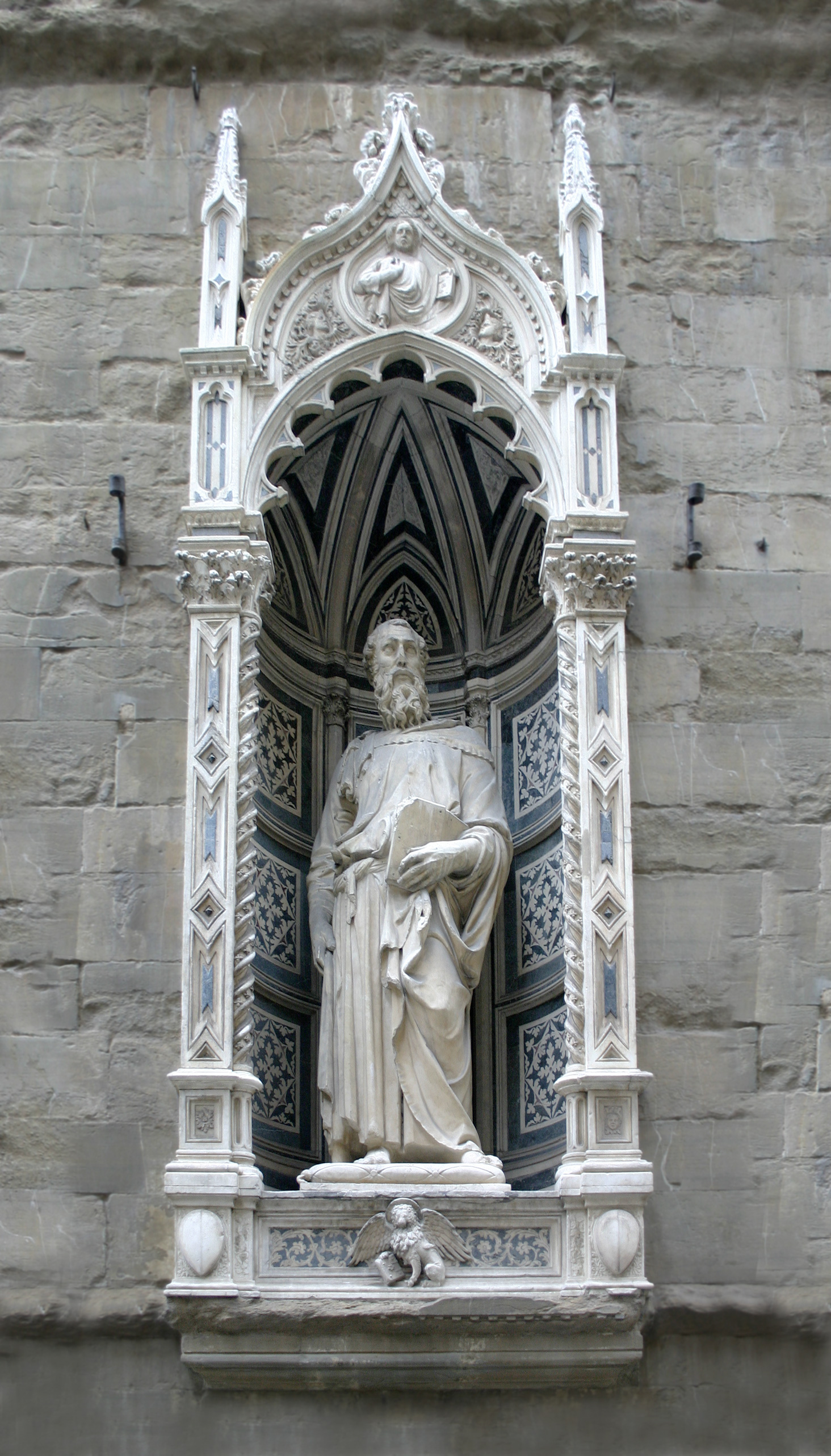 14세기 말부터 15세기 초, 피렌체의 주요 길드들은 오르산미켈레 외부 벽감에 자신들의 수호성인 조각상을 봉헌했다. 이 조각상들은 1399년부터 1430년경까지 채워졌다.[30] 특히, 가장 부유했던 세 길드는 자신들의 수호성인 조각상을 석재보다 약 10배 비싼 청동으로 제작하도록 의뢰했다.[30]조각상 | 조각가 | 의뢰 길드 | 년도 |