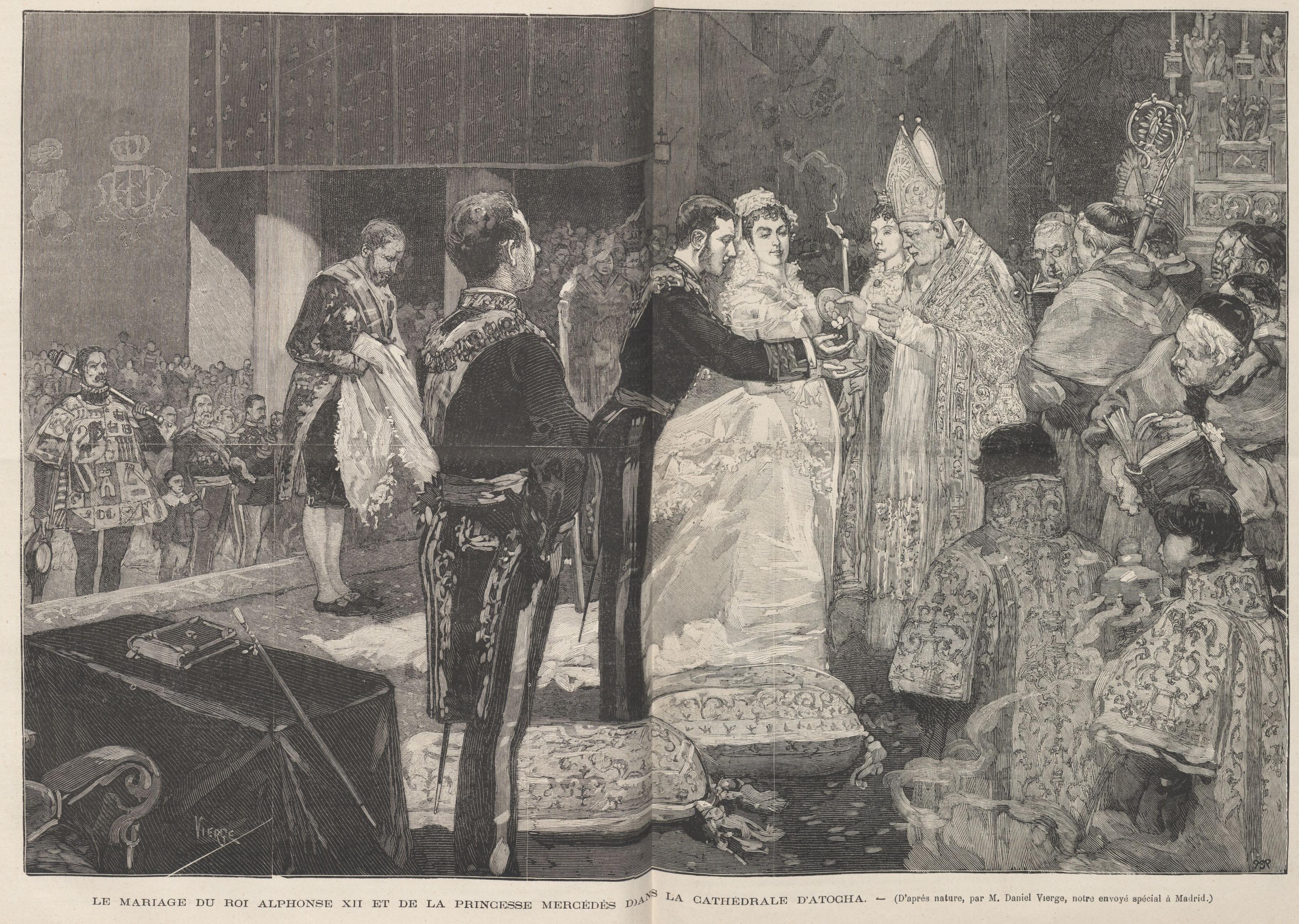1876년, 알폰소의 즉위가 실현되면서 메르세데스와의 결혼 또한 발표되었다. 그러나 이 결혼에 반대한 이사벨 2세는 카를리스타 왕위 요구자의 마드리드 공 카를로스의 딸 블랑카와 결혼시켜 국내의 대립을 진정시키려는 계획을 가지고 있었다. 이사벨 2세는 메르세데스를 만나려고조차 하지 않았다. 하지만 알폰소는 자신의 뜻대로 되지 않으면 평생 결혼하지 않겠다고 말하며, 1878년 1월 아토차 교회에서 메르세데스와