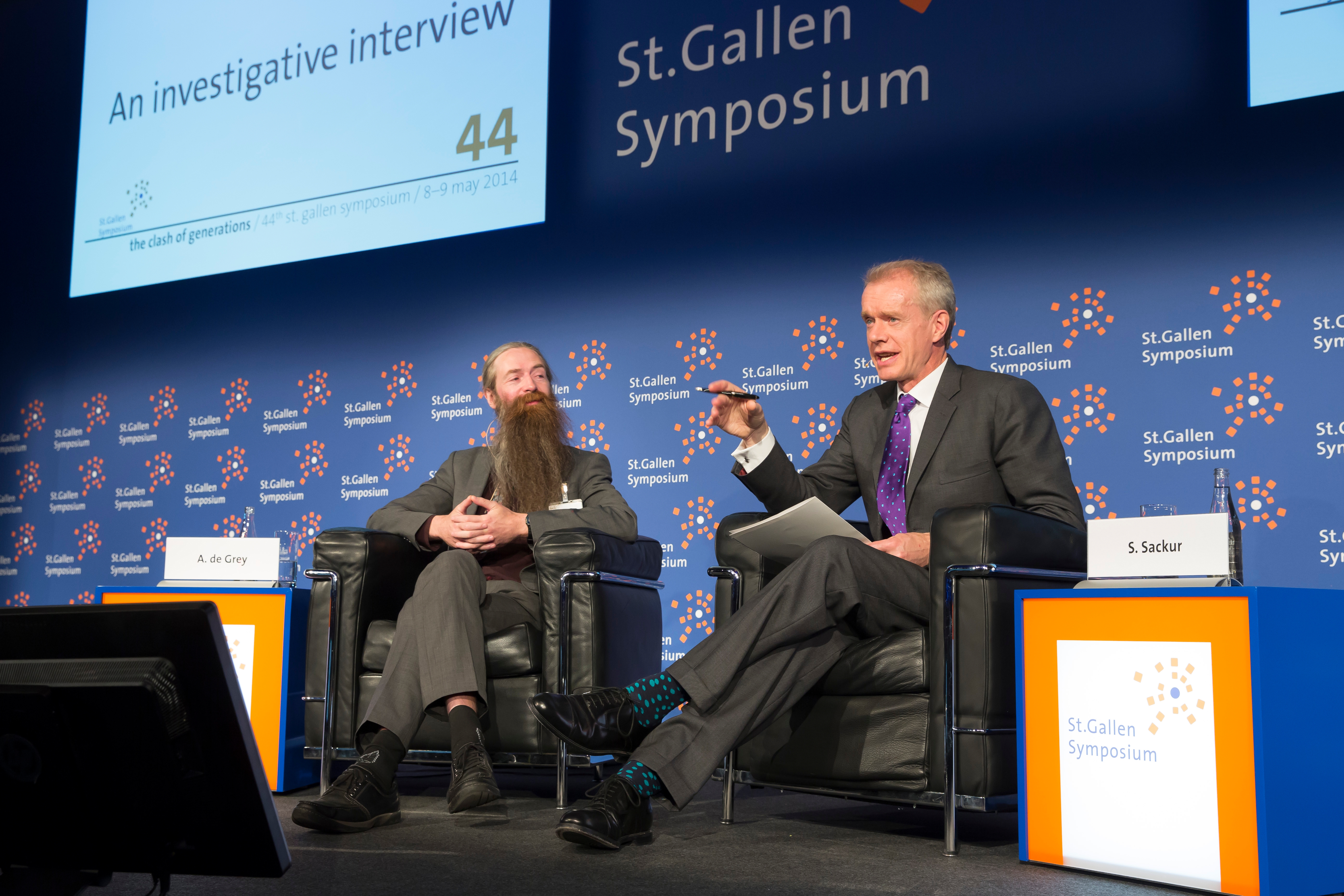 |thumb|2014년 장크트갈렌 심포지엄에서 스티븐 새커와 인터뷰하는 오브리 드 그레이]