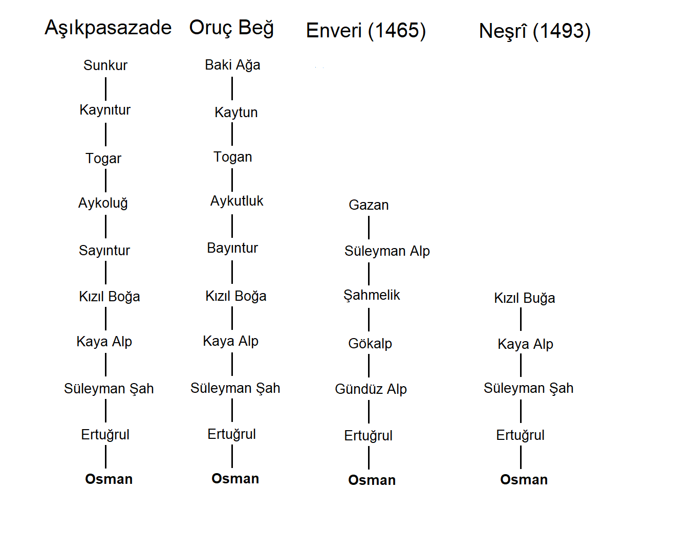가장 유명한 이야기는 오스만이 말을 타고 유프라테스 강을 건너다 익사한 쉴레이만 샤의 손자라는 것이다. 튀르크 역사가 일마즈 외즈투나는 오스만의 할아버지이자 에르투그룰의 아버지가 귄뒤즈 알프이며, 쉴레이만 샤는 아나톨리아 대중의 기억에 남은 이름이고, 실제로는 룸 셀주크 술탄국을 세운 쉴레이만 빈 쿠툴미쉬를 가리키는 것이라고 주장한다. 외즈투나는 오스만 역사가들이 오스만과 셀주크 사이의 관계를 형성하려고 시도했을 가능성이 있다고 덧붙였다. 이를 바탕으로 오스만의 추정 계보는 ''오스만 빈 에르투그룰 빈 귄뒤즈 알프 빈 카야 알프 빈 괴칼프 빈 사르쿠크 알프 빈 카이 알프''이다.[15] 다른 연구자들은 에르투그룰, 오스만, 셀주크 사이의 연결이 한 세기 후에 궁정 편년사들에 의해 대부분 만들어졌을 가능성이 있고, 오스만의 진정한 기원은 불분명하다고 동의한다.[25] 일부 오스만 자료들은 오스만과 오구즈 튀르크족의 더 먼 조상을 나타내는데, 이는 신화에 더 가깝다. 이 사람들은 노아의 아들인 야벳의 후손이며, 오스만의 계보에는 52명 이상의 조상이 포함되어 있으며 노아 예언자로 끝난다고 말한다. 이 계보에는 괴칼프와 오구즈 칸(괴칼프의 아버지)과 셀주크를 포함한 모든 오구즈 튀르크 민족들이 포함된다.[24]