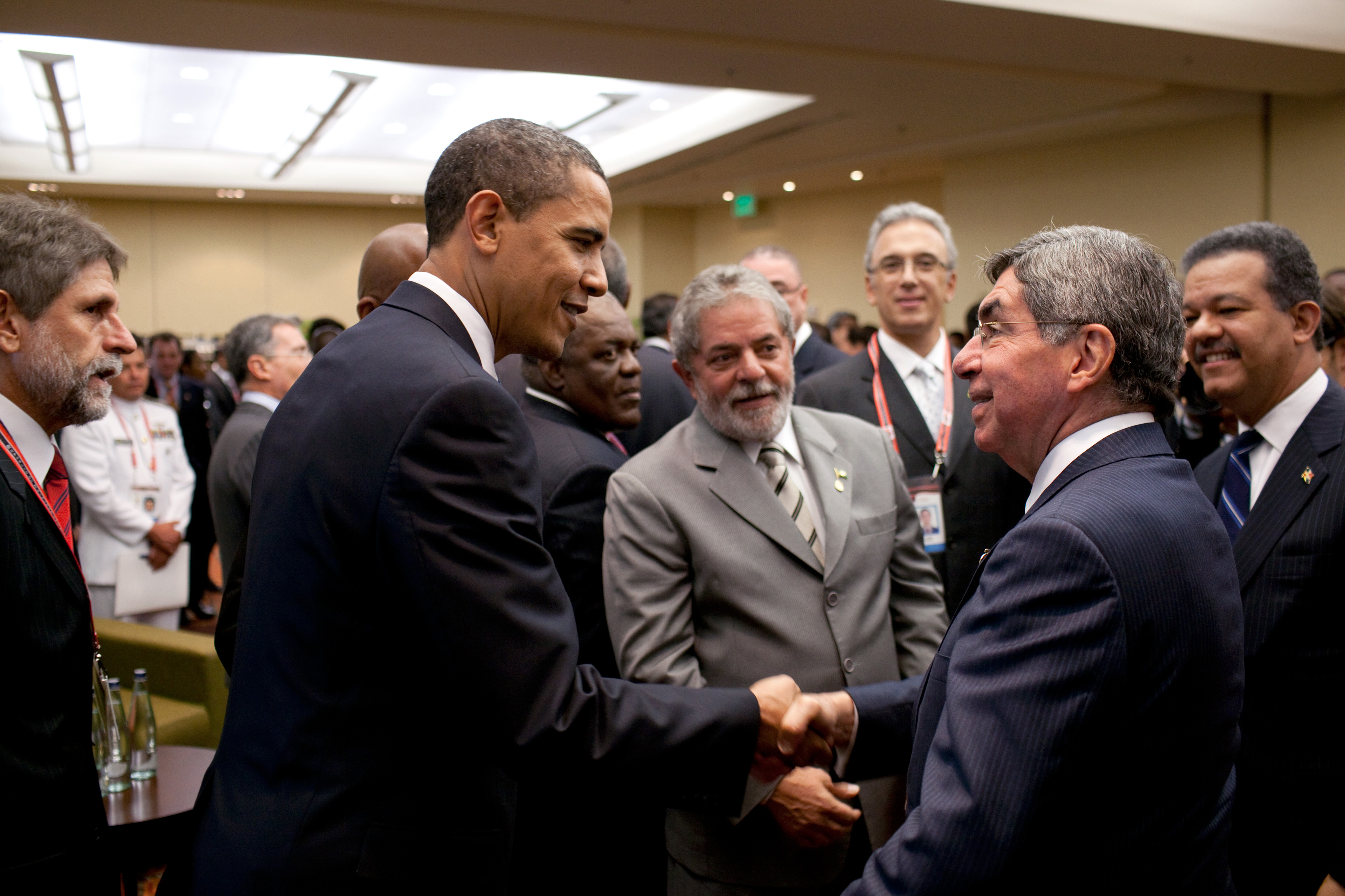 2009년 4월 18일, 트리니다드 토바고에서 열린 제5차 미주 정상회의에서 아리아스는 "우리는 잘못된 일을 해왔다"는 주제로 연설했다. 그는 다른 라틴 아메리카 지도자들을 향해 라틴 아메리카의 다른 지역과 비교한 개발 부족을 비난하고 실용주의와 군대보다 교육에 더 많은 자원을 투입할 것을 촉구했다.[9]