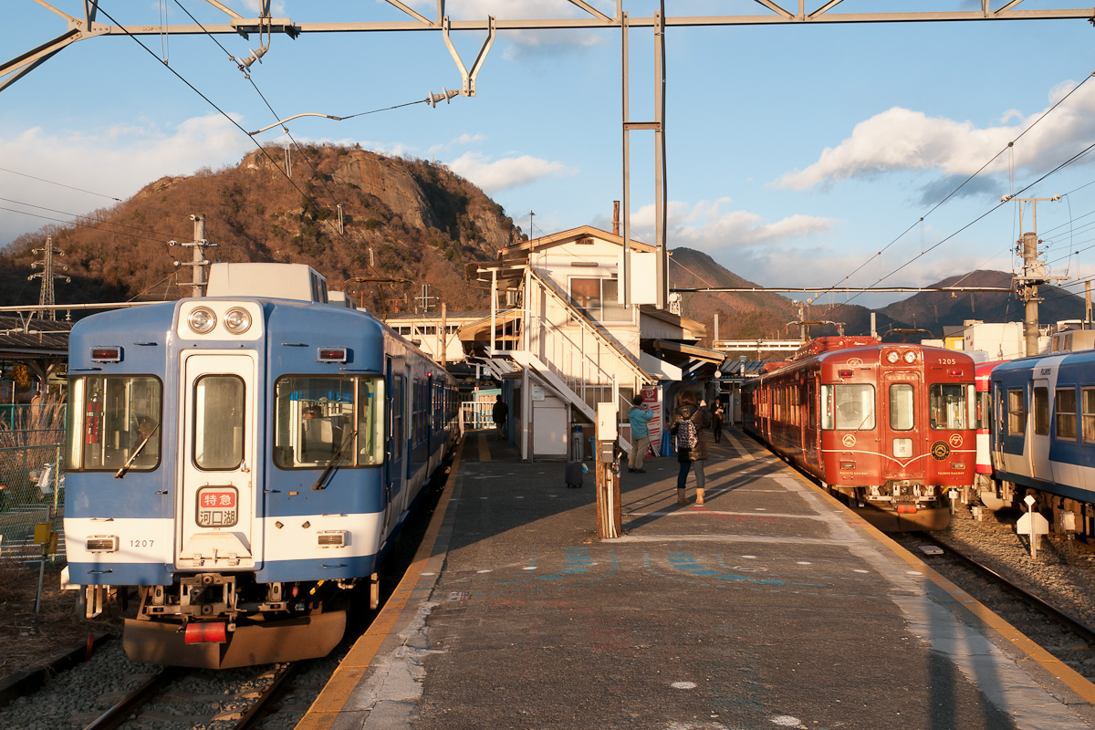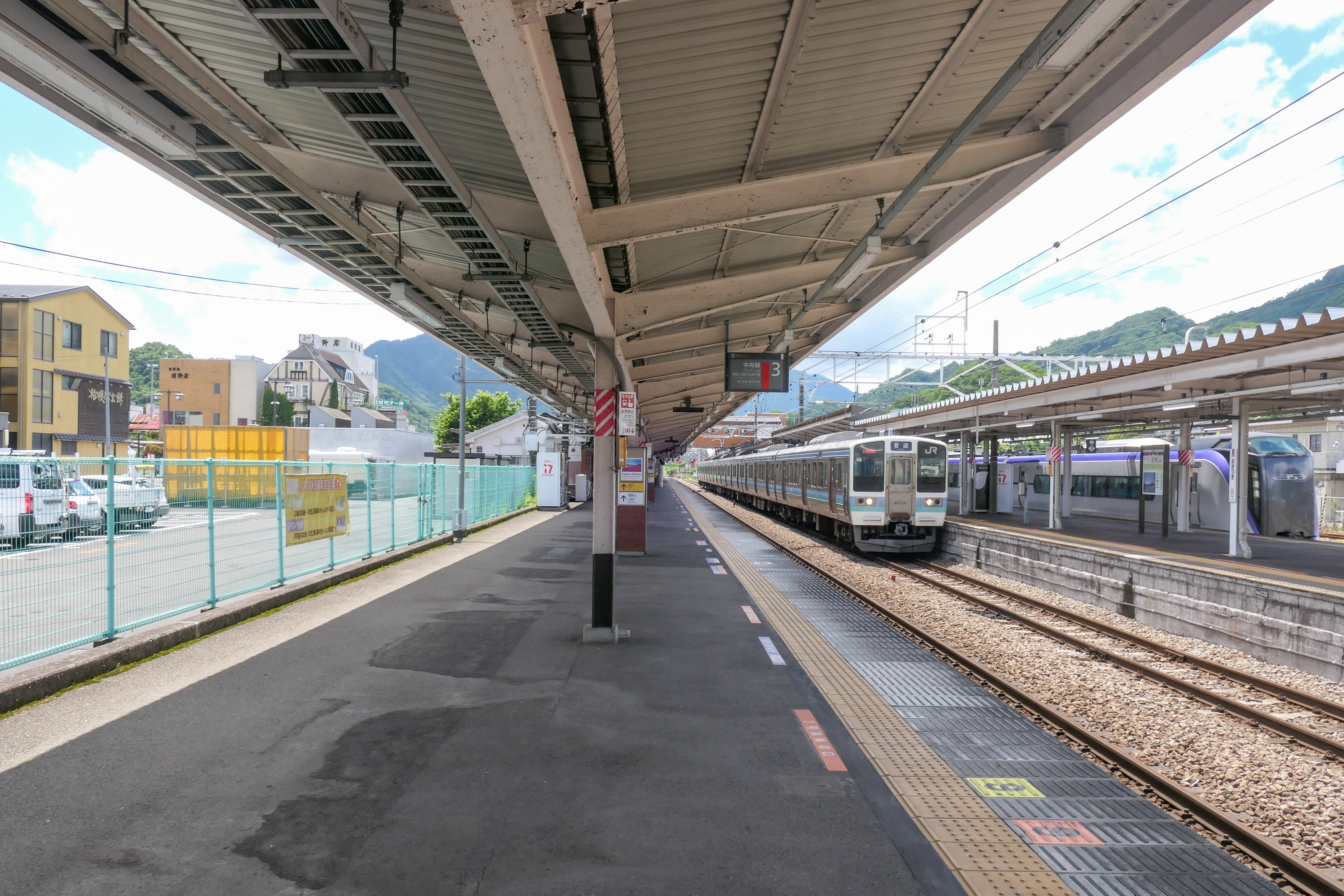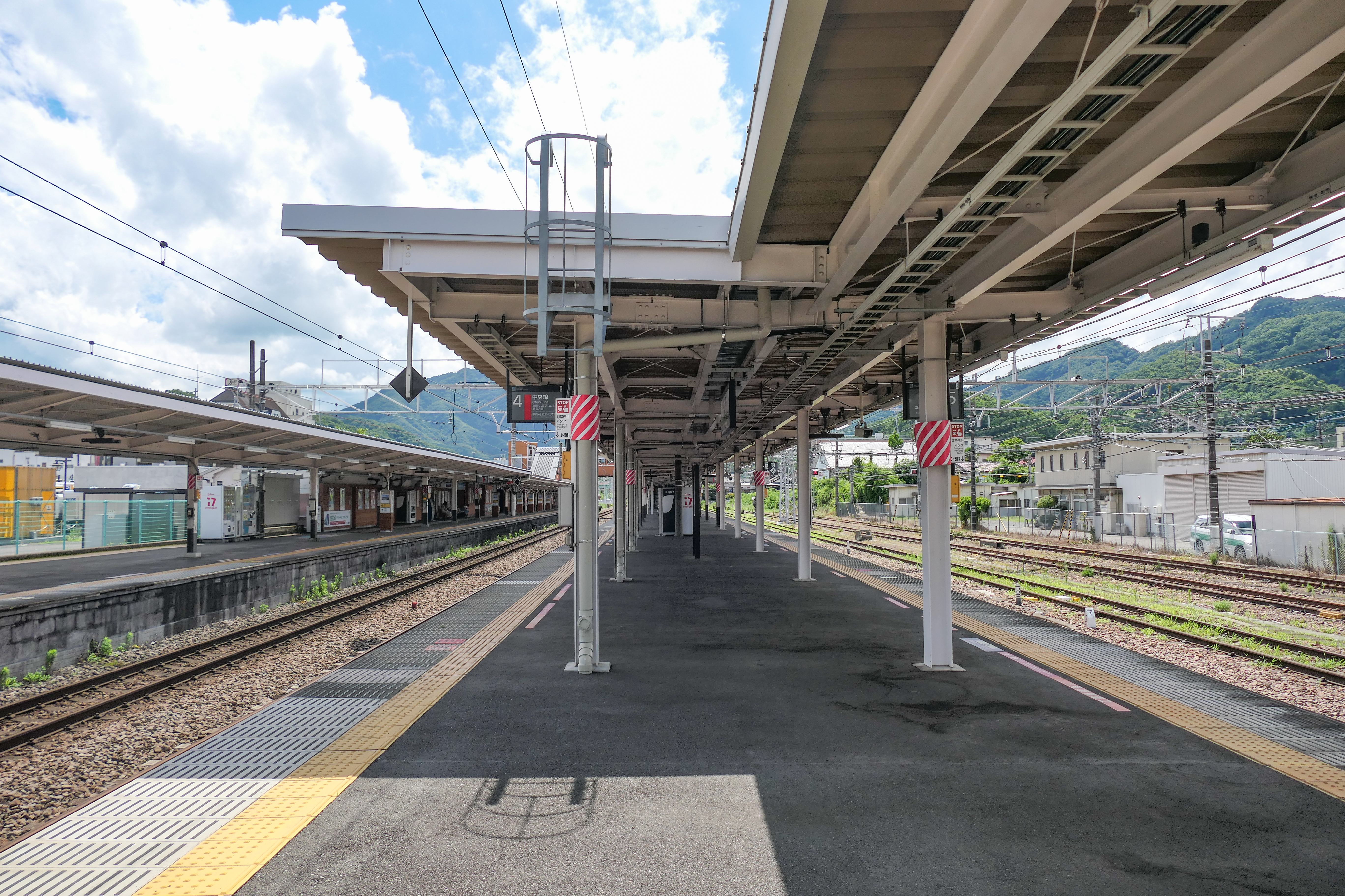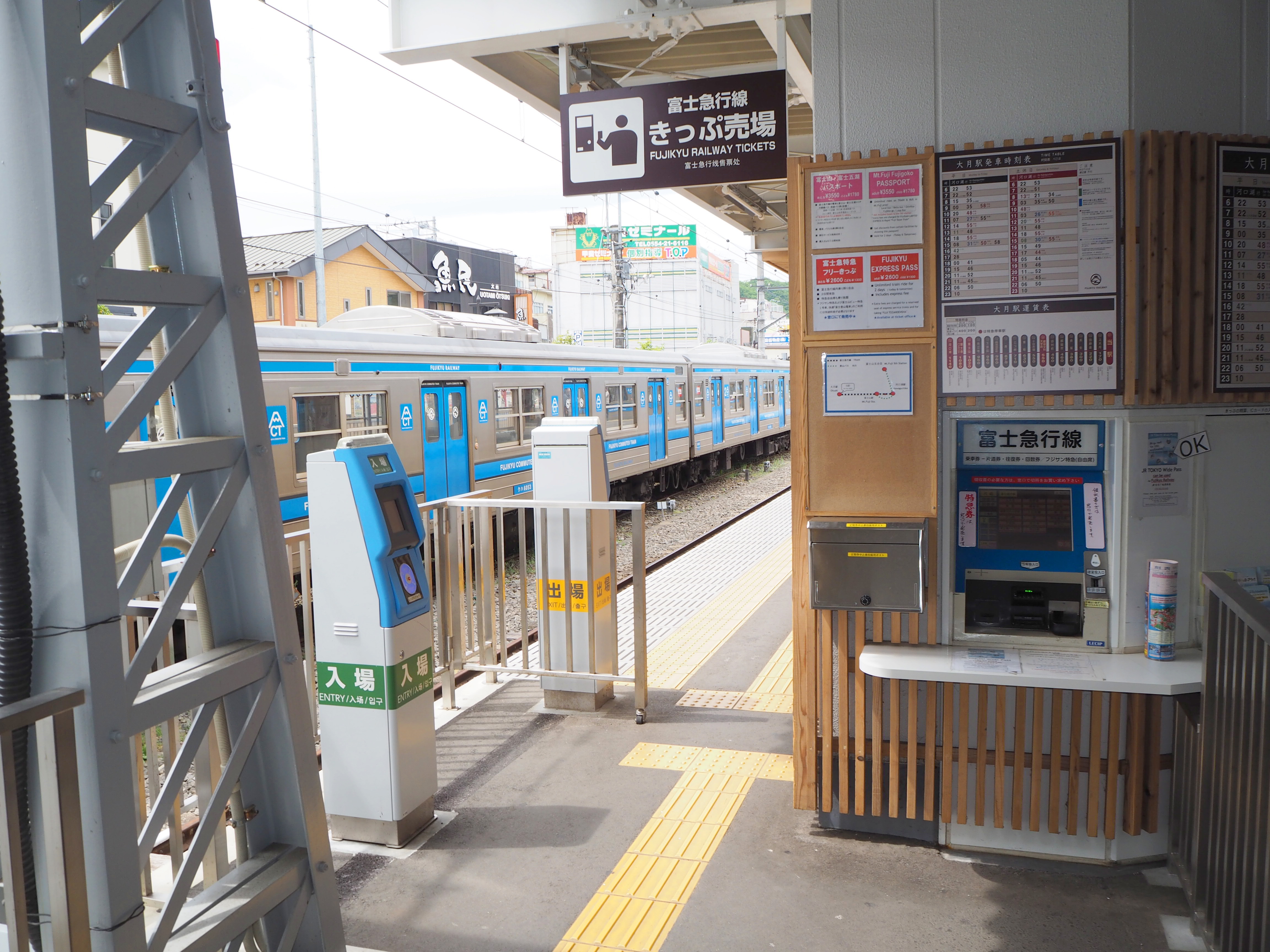 JR 단식 홈 서쪽에서 뻗어 있는 섬식 홈 1면 2선을 가진 지상역이다. 자동 발권기도 설치되어 있다. 이 홈은 '人'자 모양이다. JR선과의 사이 빈터는 과거 화물 열차용 측선이 있던 장소로, 현재는 주차장으로 이용되고 있다. 역사는 JR 단식 홈에서 후지 급행선 홈이 갈라지는 지점에 설치되어 있으며, JR과 연락 개찰구가 있고, 이에 따라 자동 발권기도 설치되어 있다. 연락 개찰구 창구는 특급 등의 예약 정리권 교환 창구를 겸하고 있어, 토요일, 휴일 오전 등에는 JR 개찰구 안에서 줄이 생기기도 한다.