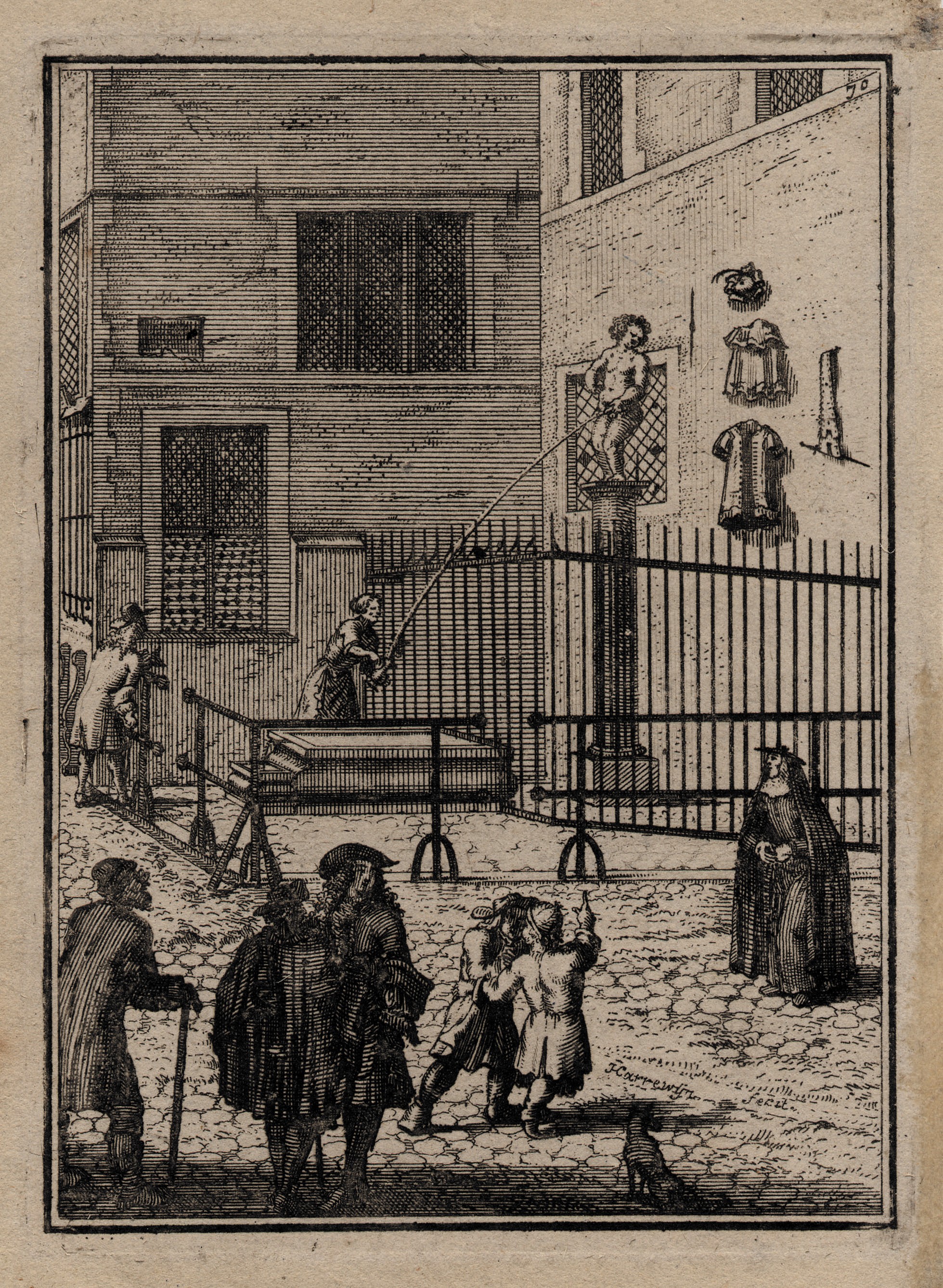 1697년에 제작된 야코부스 하르레윈의 판화를 보면,[12] 분수는 더 이상 길거리에 바로 노출되지 않고, Rue du Chênefra/Eikstraatnld와 Rue de l'Étuvefra/Stoofstraatnld 거리 모퉁이의 움푹 들어간 공간에 문으로 보호받으며 자리 잡고 있었다. 1770년에는 기존의 기둥과 사각형 이중 분지가 철거되고, 조각상은 브뤼셀의 다른 폐쇄된 분수에서 가져온 로카유 양식의 돌 틈새 장식 속에 통합되었다. 이때부터 물은 단순히 바닥의 격자판으로 흘러 들어갔으며, 이 격자판은 19세기에 분지로 교체되었다. 새로운 설치 환경 때문에 ''오줌싸개 소년''은 이전보다 작아 보이는 느낌을 주게 되었다.