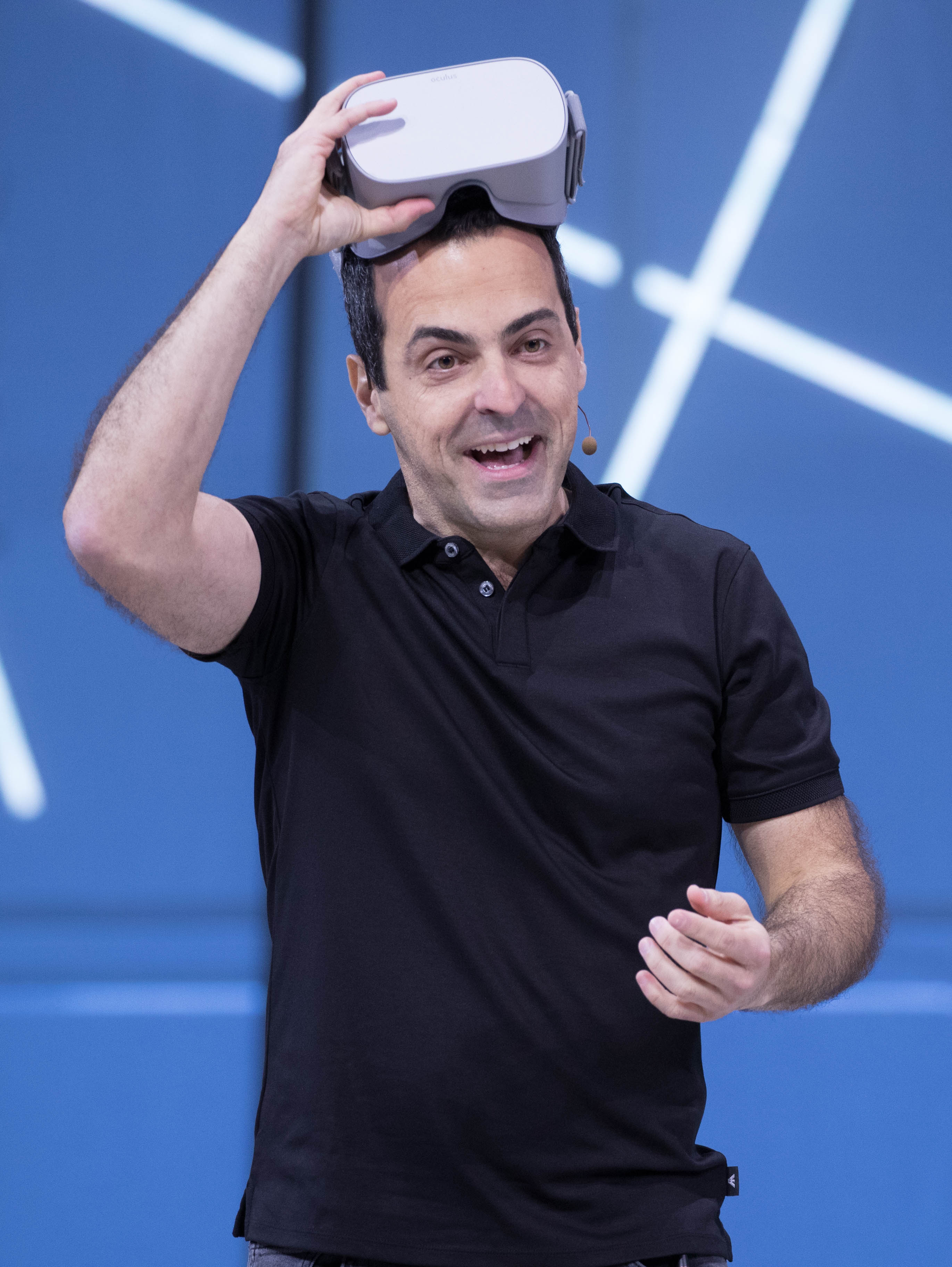 휴고 바라가 2018 페이스북 F8 컨퍼런스에서 오큘러스 고를 시연하고 있다.