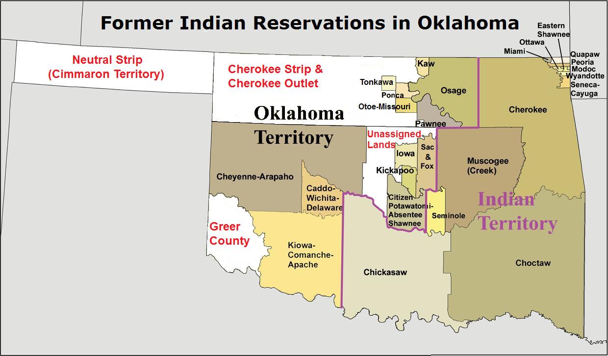 19세기 전반, 앤드루 잭슨 대통령의 “인디언 이주법”에 의해 북아메리카 전역의 인디언들이 대대로 물려받은 땅에서 쫓겨나 현재 오클라호마 주 주변 지역으로 강제 이주되었다. 대표적으로 체로키족, 초크토족, 크리크족, 세미놀족, 칙사우족의 "눈물의 길"이 잘 알려져 있다. 이들은 오클라호마 주에서 근대화에 힘썼지만, 더 많은 이주민들의 압력으로 보호구역은 분할 축소되었고 자치권은 박탈되었다.