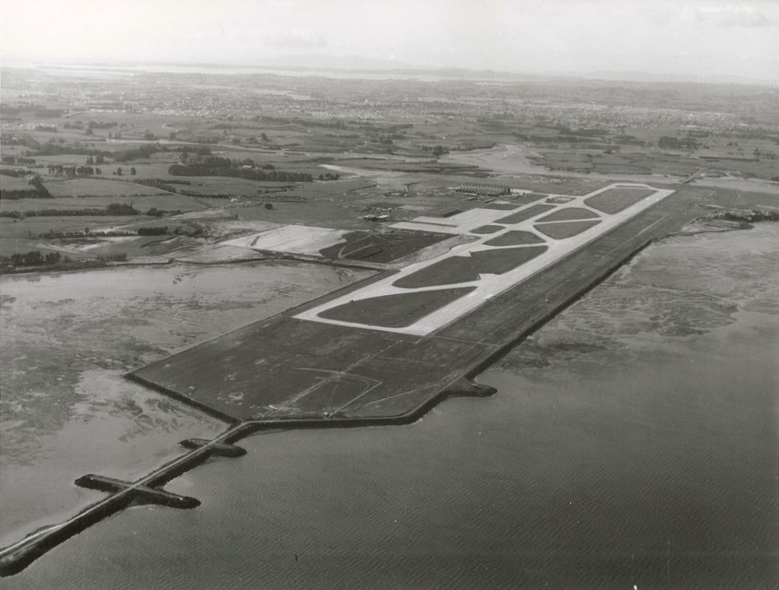 1960년 이 부지를 오클랜드의 주요 공항으로 바꾸는 작업이 시작되었다. 활주로의 대부분은 마누카우 항에서 간척지로 조성된 토지 위에 있다.[11] 최초의 출발 항공편은 1965년 11월 시드니 공항으로 향하는 에어 뉴질랜드의 DC-8이었다.[12] 공항은 이듬해 공식적으로 개장했으며, 1966년 1월 29일부터 31일까지 오클랜드 기념 주말에 '성대한 에어 쇼'가 열렸다.[13]