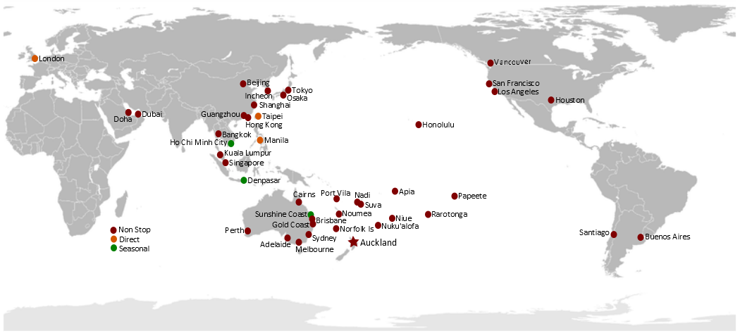 오클랜드는 북미, 남미, 아시아, 오세아니아, 중동 지역의 23개 국내선과 41개 국제선 노선과 연결된다.[39][40][41][42][43][44][45][46][47][48][49][50][51][52][53][54][55][56][57][58][59][60][61][62][63][64][65][66][67][68][69][70][71][72][73][74][75][76][77][78][79][80] 에어 뉴질랜드가 이 공항에서 가장 많은 항공편을 운항하며, 그 뒤를 이어 제트스타와 콴타스 항공이 운항한다.