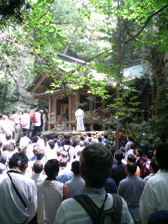 섬에 상주하는 신직이 묵는 사무소는 오마에하마(오키노시마 어항)라고 불리는 항구에 설치되어 있으며[24], 샘물의 용수가 있고, 태양광 발전장치와 선박 무선 등이 완비되어 있다. 신직은 매일 아침 신찬을 바치는 "닛쿠사이"를 일과로 하고 있다.[26]