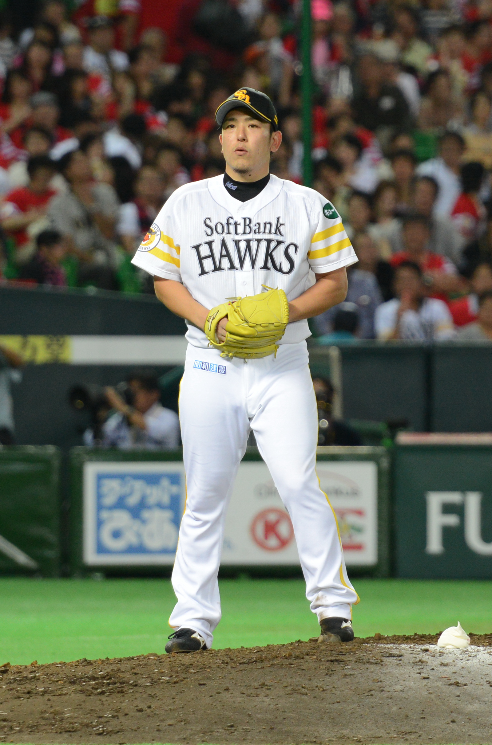 2006년 11월 21일 대학생·사회인 드래프트에서는 최대어로 주목받았다. 한때 히로시마 도요 카프를 제외한 11개 구단이 영입 경쟁을 벌인 끝에 희망 입단 제도를 통해 후쿠오카 소프트뱅크 호크스에 입단했다.[6] 묵직한 체격으로 인해 "킨다이의 에가"라는 별명을 얻었기 때문에 등번호는 한신 시절 에가와 유타카와 같은 '''28'''번이 되었다.[7] 드래프트 지명 당시에는 "토탈 밸런스가 잡힌 투수가 이상형"이라고 말하며, 모교인 교토 학원 선배 사와무라 에이지의 이름을 딴 사와무라 에이지상 획득을 목표로 내걸었다.[8]