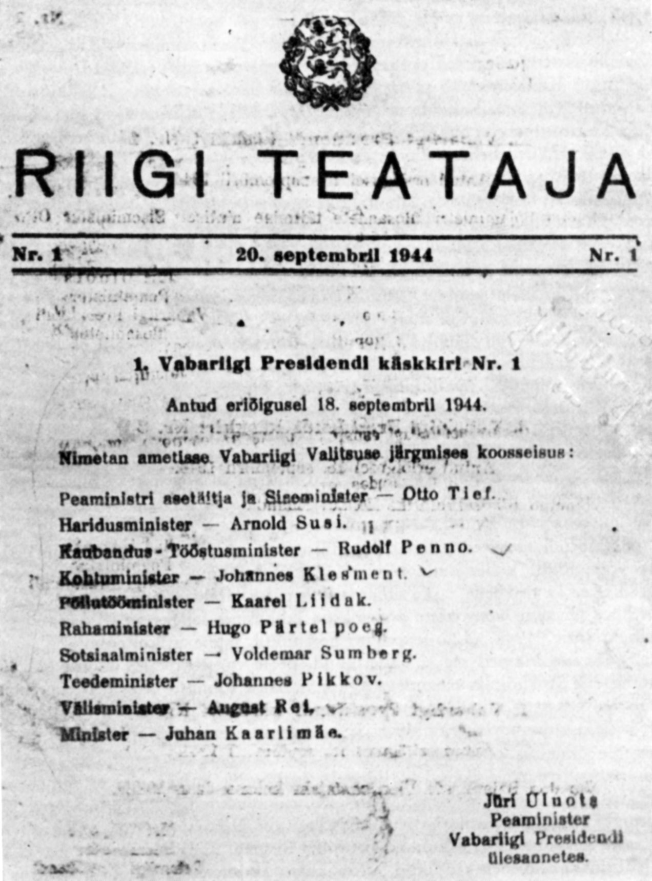 제2차 세계 대전 말기, 독일군이 철수하고 붉은 군대가 진주하는 사이의 짧은 기간 동안, 대통령 권한대행 위리 울루오츠는 오토 티에프를 총리로 임명하고 1944년 9월 18일에 내각을 소집하도록 요청했다.[1] 티에프는 에스토니아 제1공화국과의 법적인 연속성을 유지하는 에스토니아 공화국의 독립 회복을 선언하고, 수도 탈린으로 돌아가 붉은 군대에 대한 저항을 시도했지만, 9월 22일 붉은 군대가 탈린에 진입했다.[1]