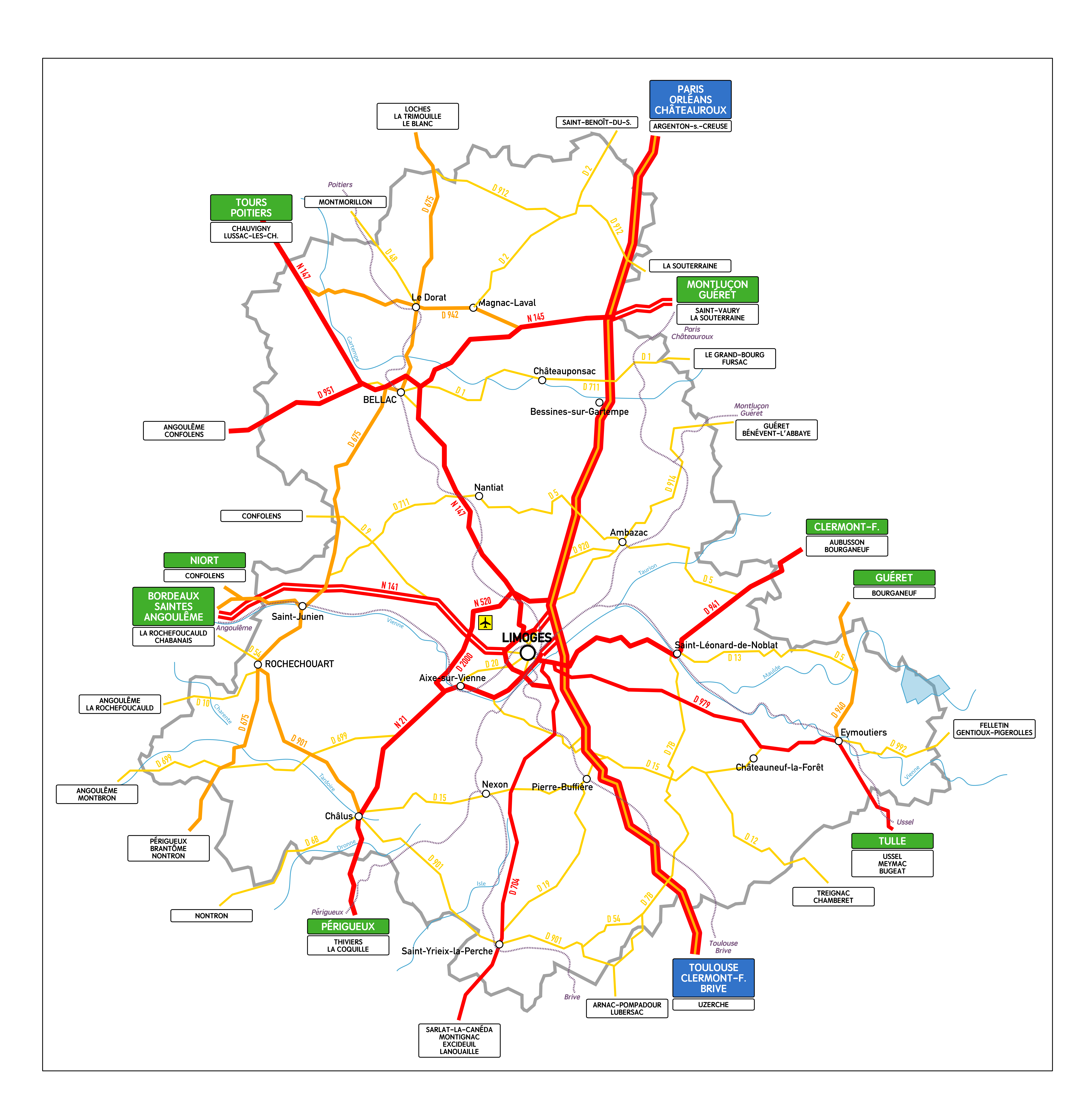 레지옹과 중앙고지대의 영향으로 오트비엔주는 오랫동안 주요 도로에서 제외되어 고립에 시달렸다. 1990년대, 특히 2000년대에 자동차 도로 계획에서 뚜렷한 개선이 이루어졌는데, 이는 비에르종과 브리브라가이야르드 구간이 무료인 A20의 시험 사용 덕분이었다. 또한 앙굴렘 방면으로 향하는 국도 141호선이 오트비엔주 근처에 개통되었다.