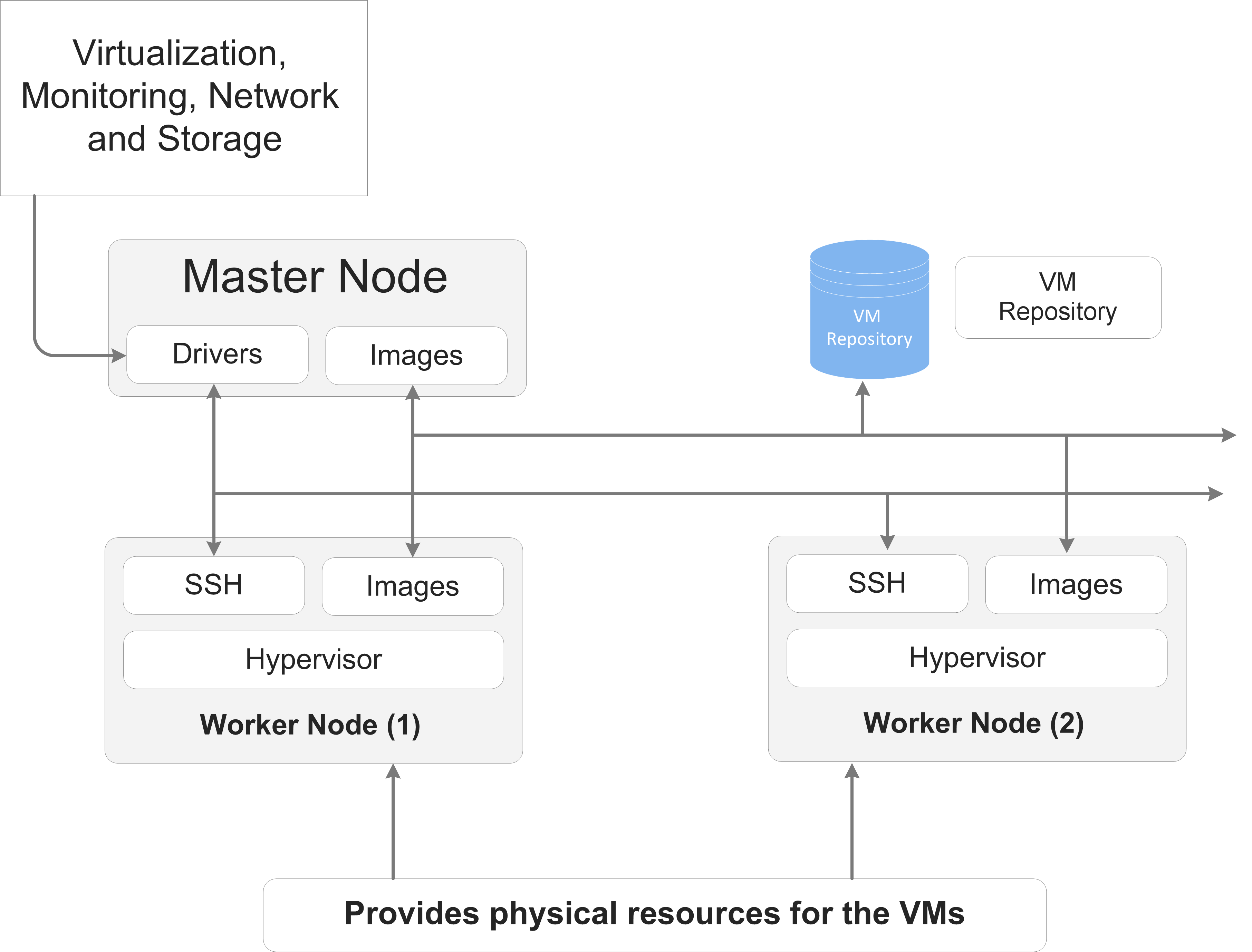 작업 노드, 즉 하이퍼바이저가 활성화된 호스트는 마스터 노드에 의해 제출된 모든 작업을 처리하는 데 필요한 실제 컴퓨팅 리소스를 제공한다. 오픈네뷸라 하이퍼바이저가 활성화된 호스트는 Vmware, Xen 또는 KVM과 같은 가상화 하이퍼바이저를 사용한다. KVM 하이퍼바이저는 기본적으로 지원되며 기본적으로 사용된다.가상화 호스트는 가상 머신을 실행하는 물리적 머신이며, 다양한 플랫폼을 오픈네뷸라와 함께 사용할 수 있다. 가상화 하위 시스템은 마스터 노드에서 필요한 작업을 수행하기 위해 이러한 호스트와 상호 작용한다.