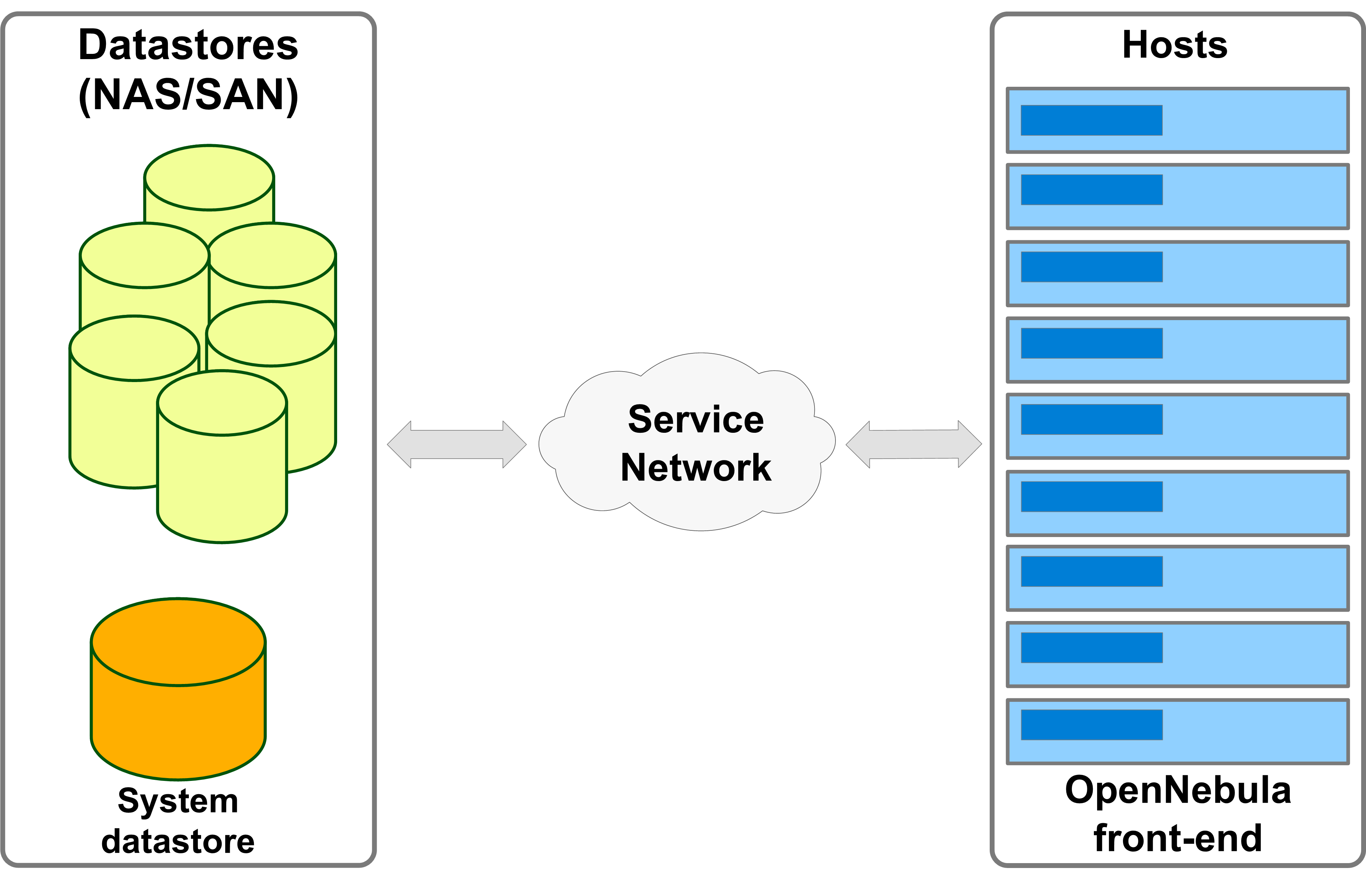 오픈네뷸라에는 시스템 데이터스토어, 이미지 데이터스토어 및 파일 데이터스토어의 세 가지 데이터스토어 클래스가 포함되어 있다. 시스템 데이터스토어는 가상 머신을 실행하는 데 사용되는 이미지를 저장한다. 이미지는 사용되는 스토리지 기술에 따라 원본 이미지의 전체 복사본, 델타 또는 심볼릭 링크일 수 있다. 이미지 데이터스토어는 디스크 이미지 저장소를 저장하는 데 사용된다. 가상 머신이 배포되거나 조작될 때 이미지 데이터스토어의 이미지가 시스템 데이터스토어로 이동하거나 이동된다. 파일 데이터스토어는 일반 파일을 위해 사용되며 커널, 램 디스크 또는 컨텍스트 파일에 자주 사용된다.