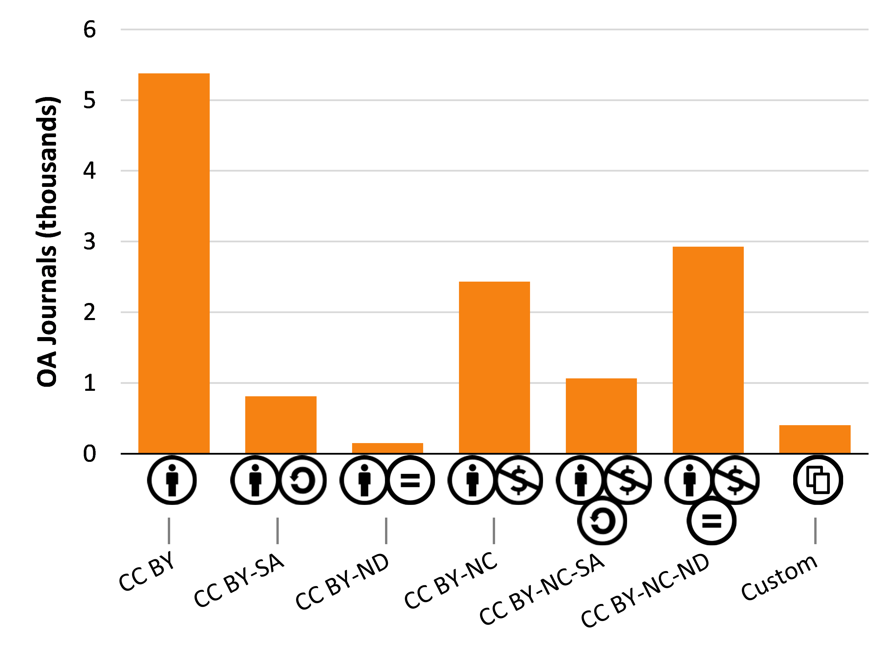 가장 널리 사용되는 라이선스 중 하나는 CC BY 라이선스이며, 저작자 표시만 지키면 상업적 이용 및 2차적 저작물 작성을 허용한다.[65] 더 제한적인 크리에이티브 커먼즈 라이선스도 사용된다. 드물게 일부 소규모 학술 저널에서는 맞춤형 오픈 액세스 라이선스를 사용하기도 한다.[64][66]