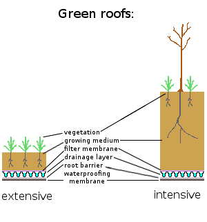 옥상 녹화는 식재 기반의 깊이와 유지 관리의 필요성에 따라 집약형, 반집약형, 광범위형으로 분류할 수 있다. 광범위형 옥상 녹화는 전통적으로 10psf에서 25psf의 식물을 지지하는 반면[47], 집약형 옥상 녹화는 80psf에서 150psf의 식물을 지지한다.[48] 큰 식물이나 일반 잔디를 재배하기 위해 상당한 깊이의 토양이 필요한 전통적인 옥상 정원은 관개, 비료 공급 및 기타 유지 관리가 필요하므로 노동 집약적인 것으로 간주되어 집약형으로 분류된다. 집약형 옥상은 접근이 용이하고 주방 허브에서 관목 및 소형 나무에 이르기까지 모든 것을 포함할 수 있는 공원과 같은 형태를 띤다.[49]