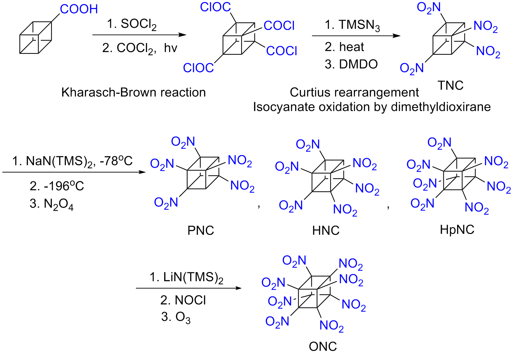 테트라니트로큐반 이후 단계부터는 니트로기 도입이 더욱 어려워진다. 이때는 니트로기의 알파(α) 위치에 있는 수소 원자가 산성을 띠는 성질을 이용한다. 염기를 사용하여 음이온을 만들고, 이를 사산화이질소와 반응시켜 5번째, 6번째, 7번째 니트로기를 차례로 도입하여 헵타니트로큐반을 얻는다. 마지막 8번째 니트로기는 니트로소화 반응을 거친 후 오존으로 처리하여 도입한다.