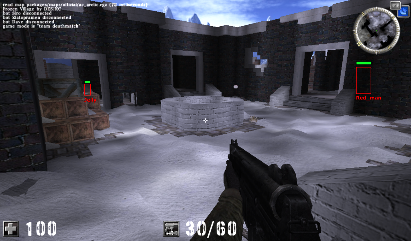 AssaultCube에서 월핵을 사용하면 통로에 숨어 있는 플레이어들이 빨간색 사각형으로 표시된다.