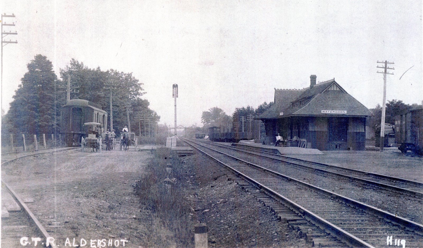 올더숏역은 1854년 그레이트 웨스턴 철도에 의해 '''워터다운역'''(Waterdown Station)이라는 이름으로 처음 문을 열었다.[10] 이 역은 베이뷰 분기점에서 동쪽으로 토론토 방면 첫 번째 기차역이었다. 초기 역 건물은 대합실, 화물실, 역장실로 이루어진 비교적 작은 목조 건물이었다. 역 이름은 실제 워터다운 마을과는 조금 떨어져 있었지만, 마을로 이어지는 워터다운 로드와 가까웠기 때문에 '워터다운역'으로 명명되었다.[10] 1882년, 그레이트 웨스턴 철도는 그랜드 트렁크에 인수되었다.[11]이 노선은 토론토와 해밀턴 사이를 오가는 통근열차뿐만 아니라, 토론토에서 미국으로 향하는 국제열차도 자주 운행했다.[10] 1896년에는 토론토, 해밀턴 & 버팔로 철도가 그랜드 트렁크의 철도 노선을 이용하여 토론토 유니언역까지 열차를 운행할 수 있는 권리를 얻었다. 이 열차들은 대부분 모기업인 캐나다 태평양 철도와 뉴욕 센트럴 철도의 기관차와 객차를 사용했다.[12]