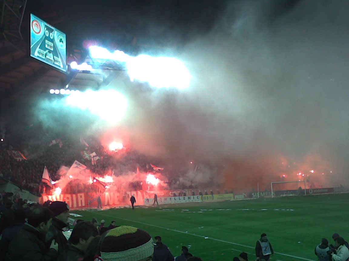 올림피아코스 팬들은 팀에 대해 열정적이고 강렬한 지지를 하는 것으로 알려져 있으며, 홈 경기 분위기는 적대적인 것으로 알려져 있다. UEFA컵 2004-05에서 뉴캐슬 유나이티드를 상대할 때, 영국 방송 채널 5에서 중계했는데, 객원 해설가이자 전 잉글랜드 국가대표 토니 코티는 경기 분위기에 대해 지속적으로 언급했다. 그는 이 경기장이 가장 분위기가 있는 경기장인지에 대한 질문에 ''"저는 그렇다고 생각합니다. 여러 곳의 분위기에 대해 들어보고 가보면 실감하는 것 이상이 아닐 때도 있지만... 그러나 이 곳은 진짜 [분위기를 느끼는 것 이상을 체감하는] 그곳입니다."''라고 답했다.[232] 보르도가 카라이스카키스 스타디움 원정을 앞두었을 때, 경험 많은 체코 국가대표 윙어 야로슬라프 플라실은 모나코 시절의 경기를 언급하며 올림피아코스 팬들이 홈경기에서 만드는 적대적인 분위기에 대해 다음과 같이 증언했다. ''"이곳에서 저는 경기장에서 경험할 수 있는 가장 강력한 인상을 주는 분위기를 경험했고, 이곳은 우리에게 지옥과 같을 것이라고 예상합니다. 그들의 응원은 홈팀에게 매우 큰 도움이 될 수 있을 것입니다."''[233] 파리 생제르맹의 스트라이커 즐라탄 이브라히모비치는 2013년 9월 17일 올림피아코스-파리 생제르맹 경기 후, 올림피아코스 팬들에 대해 다음과 같이 경의를 표했다. ''그들은 환상적인 관중들 앞에서 활약합니다. 올림피아코스 팬들은 놀라웠습니다. 제 동료 올로프 멜베리가 여기서 활약했었고, 그는 서포터에 대해 이야기한 적 있습니다. 저는 실감하지 못했으나, 이제 이해합니다. 놀랍습니다. 이는 올림피아코스에게 홈경기에서 크게 유리한 점입니다.''[234][235] 파리 생제르맹의 억만장자 구단주 나세르 알-켈라이피는 ''저는 이곳 팬들에게 큰 존경심을 표합니다. 저는 올림피아코스 팬들과 같은 팬들을 인생에서 만나본 적이 없습니다.''라고 말했다.[236]