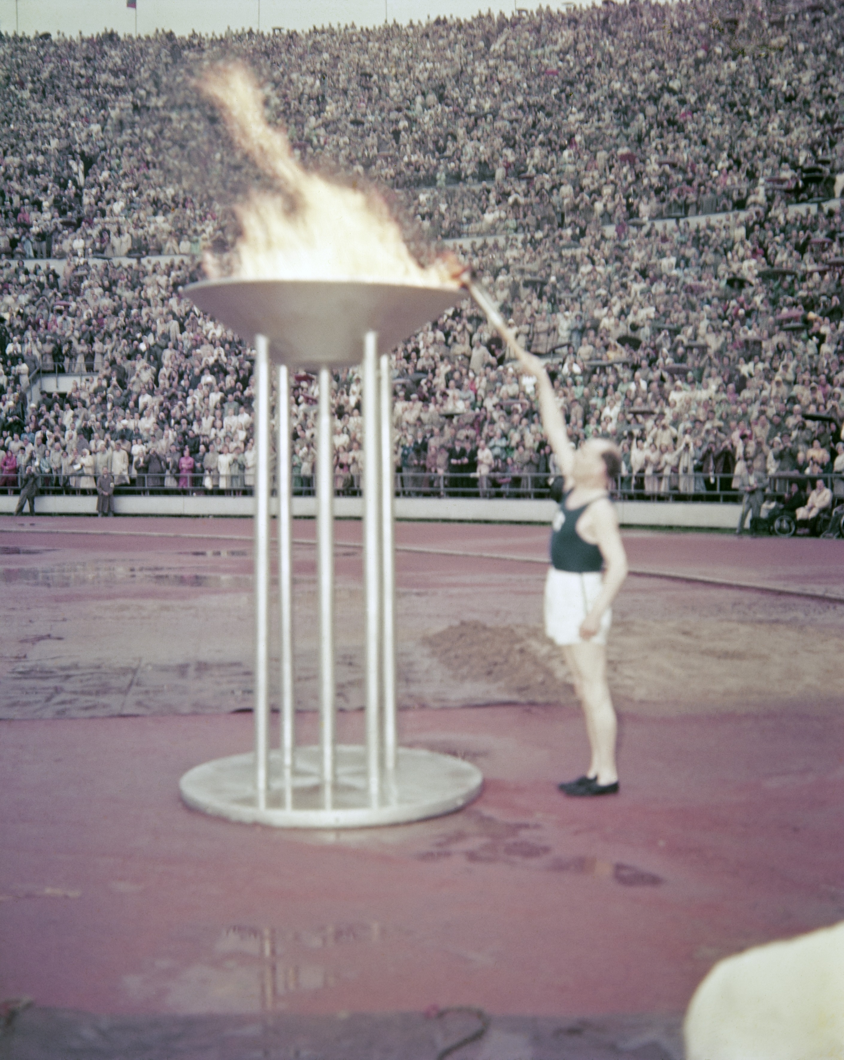 1952년 헬싱키에서 파보 누르미가 성화에 불을 붙이는 모습
