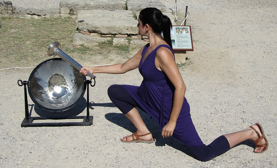 그리스에서 열린 올림픽 성화 점화 연습 도중 태양 에너지를 이용하여 성화를 점화하는 모습