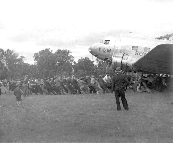 1934년, 맥로버트슨 트로피 항공 경주(런던-멜버른 항공 경주로도 알려짐)에 참가한 KLM의 더글러스 DC-2 여객기 '더 유이벌'(De Uiver|더 유이벌nl)이 심한 뇌우 속에서 길을 잃고 마을 경마장에 비상 야간 착륙을 했다. 지역 주민들은 가로등 시스템을 이용하여 A-L-B-U-R-Y를 모스 부호로 조난당한 조종사들에게 신호를 보냈고, ABC 라디오 방송국 2CO의 속보를 들은 주민들이 자동차 헤드라이트로 임시 활주로를 비춰 안전하게 착륙하도록 유도했다. 다음 날, 많은 지역 자원봉사자들이 좌초된 항공기를 진흙에서 꺼내는 것을 도왔고, 항공기는 이륙하여 멜버른으로 향했으며, 그곳에서 경주 핸디캡 부문에서 1위를 차지했고 종합 2위를 기록했다.[15][16] 이 사건은 올버리의 인지도를 높이는 중요한 계기가 되었다.