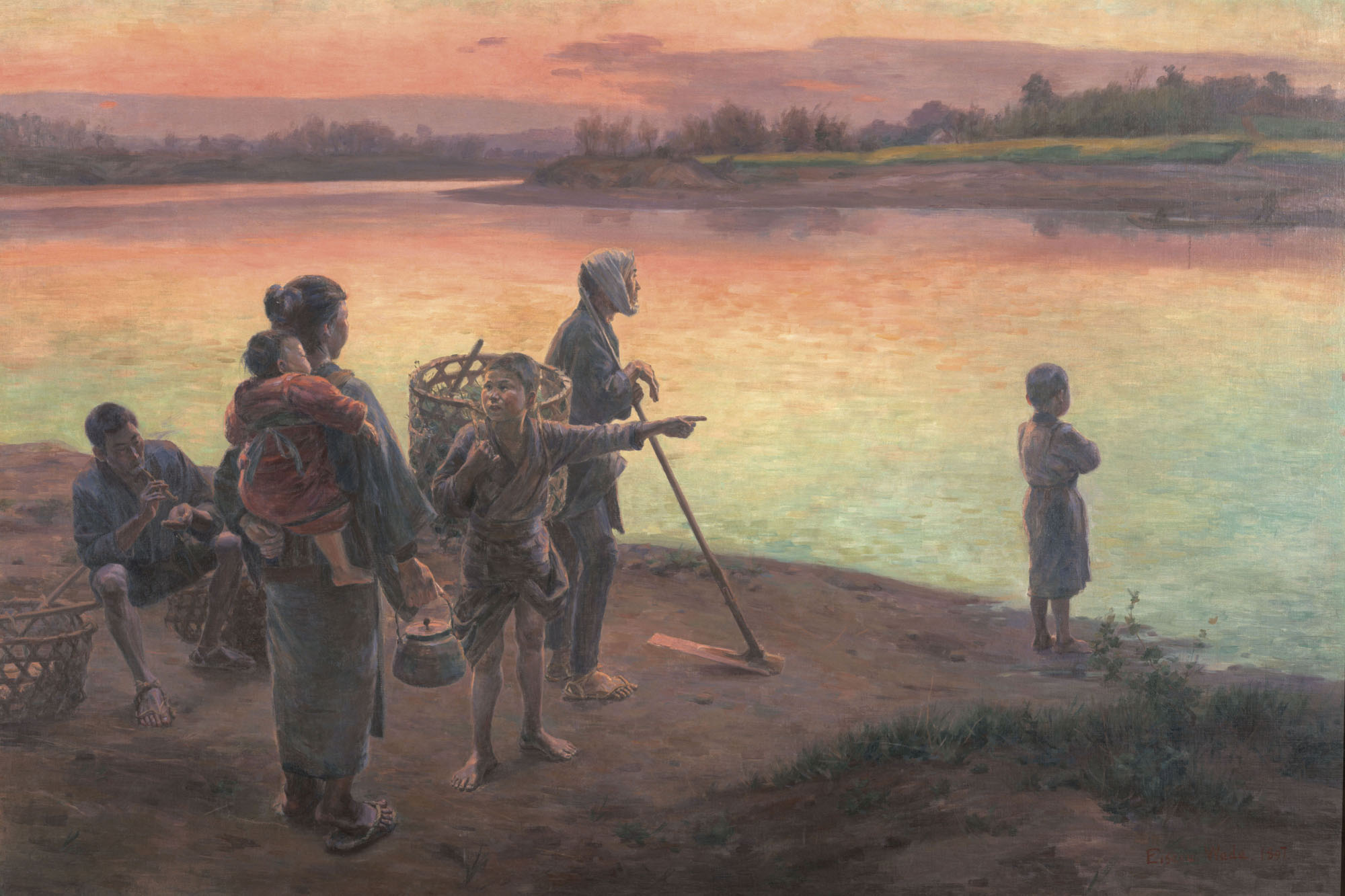 와다 에이사쿠는 일본의 서양화가로, 가고시마현 출신이다. 도쿄 미술학교에서 서양화를 배우고 조교수를 거쳐 졸업 후 프랑스 유학을 다녀왔다. 귀국 후 도쿄 미술학교 교수를 역임하고 제국 미술원 회원, 문화훈장을 수여받았다. 초기에는 사실주의 화풍을 따랐으며, 말년에는 풍경화와 정물화에 집중했다. 주요 작품으로는 《나룻배의 저녁》, 《코다마》, 《고향의 생각》 등이 있다.