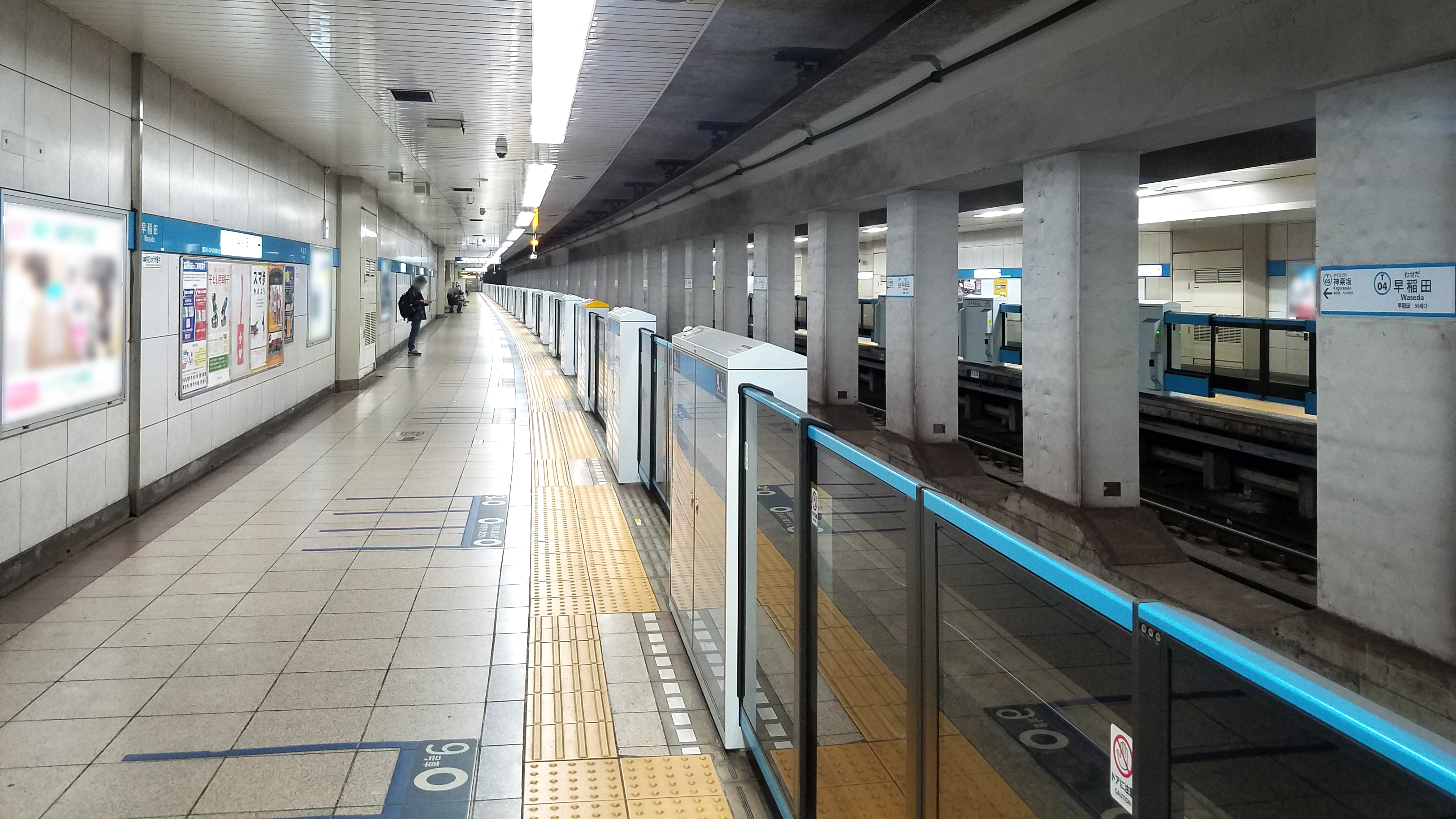 도자이 선 와세다 역은 상대식 승강장 2면 2선을 갖춘 지하역이다. 와세다 대학 방면 출구는 와세다 대학 방면 개찰구와 직결되어 있다.