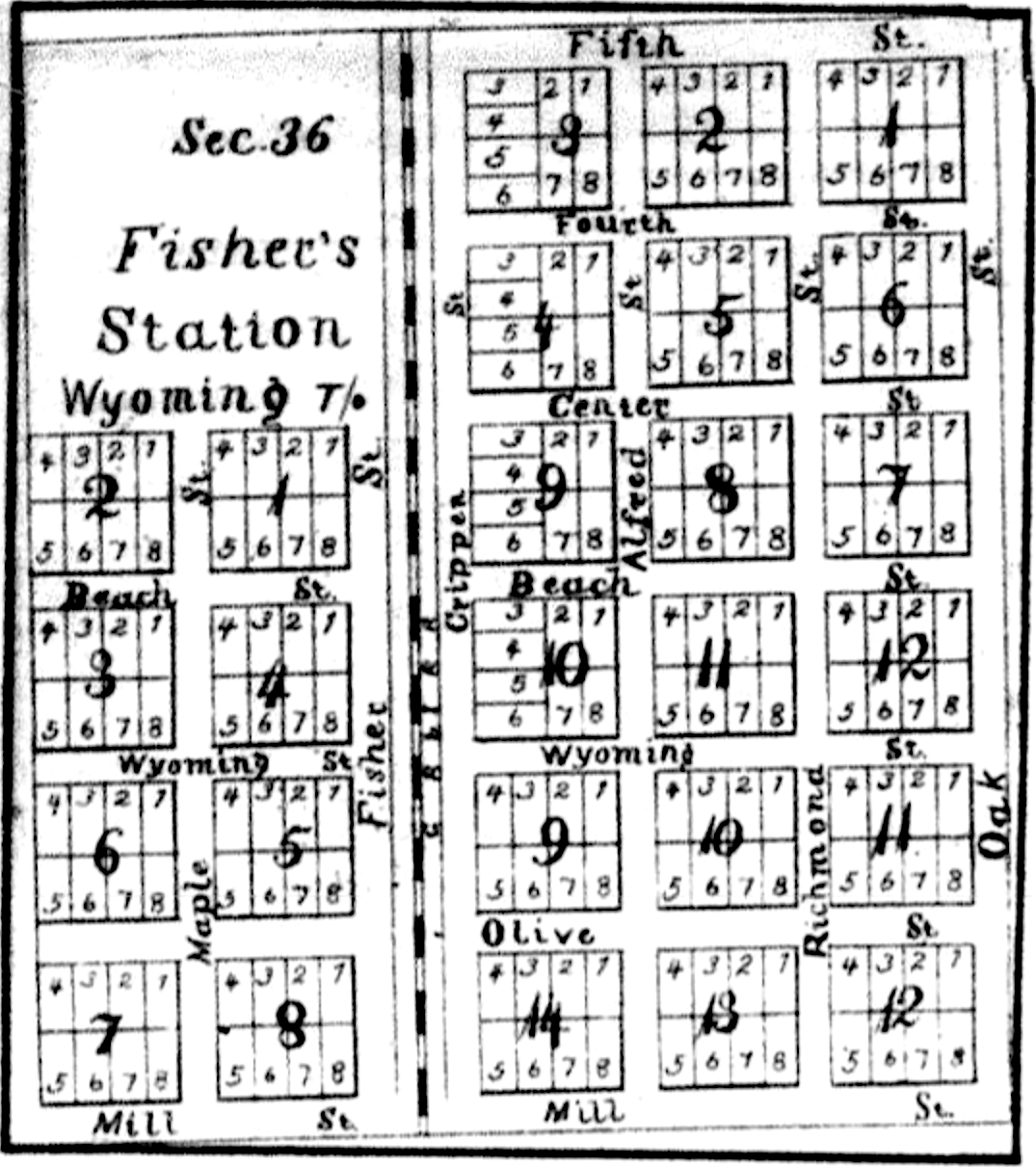 데이비드 피셔는 1857년 와이오밍에 도착하여 불에 탄 고든의 오래된 벅 크릭 제분소를 대체하기 위해 고든의 부동산에서 토지를 매입하고 그 자리에 새로운 제분소를 건설했다. 1869년에는 그랜드 래피즈와 인디애나 철도역이 건설되었고, 1870년 피셔는 철도역 주변에 개발될 "피셔 스테이션"이라는 마을을 계획했다. 1871년에는 우체국이 건설되었고 1873년 12월에는 이 지역이 구획되었다.[7][14] 와이오밍 타운십의 인구는 1874년에 2,008명으로 증가했고, 피셔 스테이션의 인구는 1888년에 65명이었다.[7]