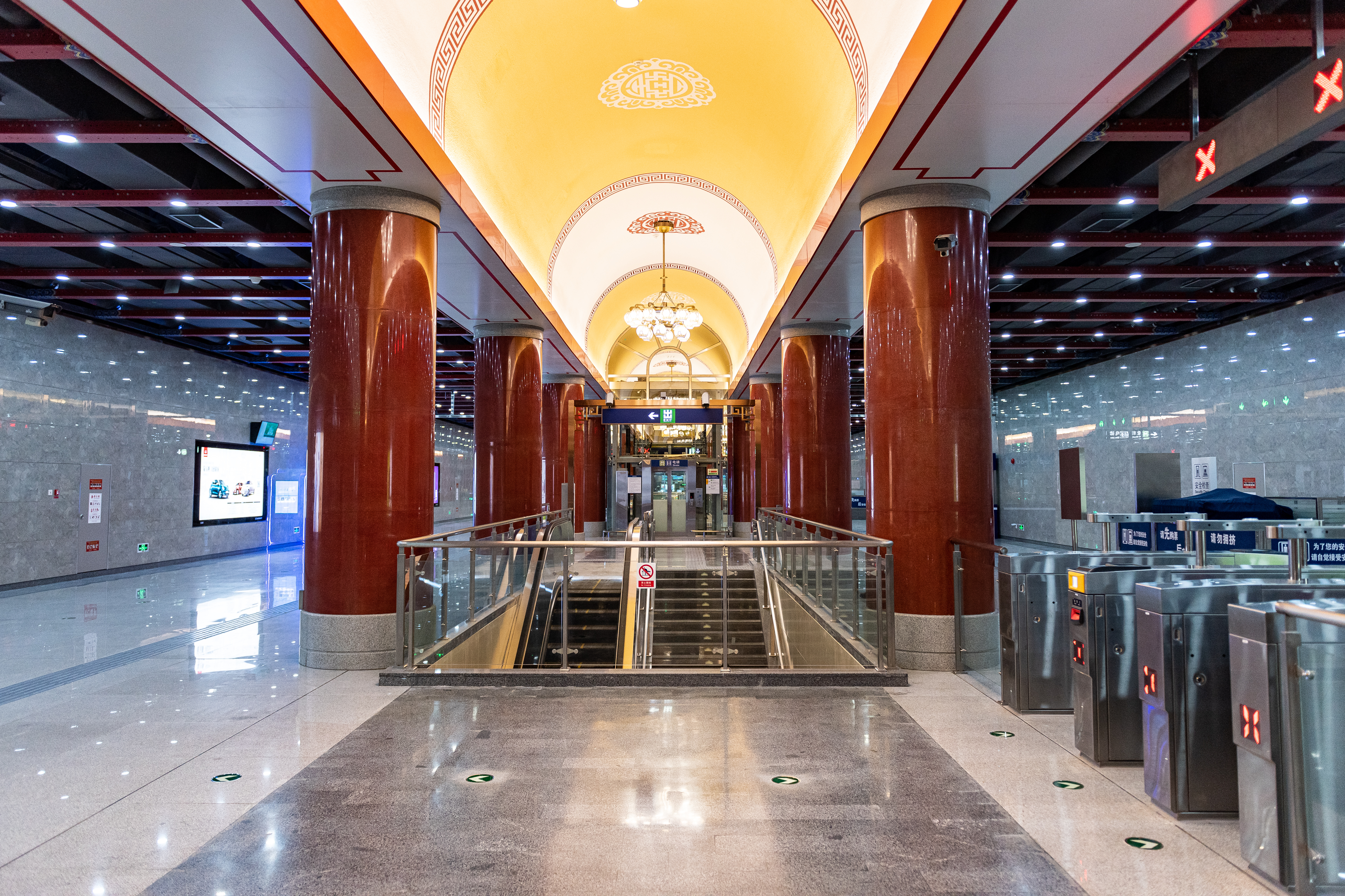 이 역은 지하 3층, 3경간 지하 굴착역으로[2], 지하 1층은 대합실, 지하 2층(승객 출입 불가)은 역 내 장비층, 지하 3층은 승강장 층이다[3]. 역의 전체 길이는 262.1m, 역 지하층의 깊이는 25.55m이며, 역 중심선의 절대 높이는 28.77m이다. 이 역은 "이메이징화"(艺美京华)를 주제로 제작되었다[4].층 | 시설 | |