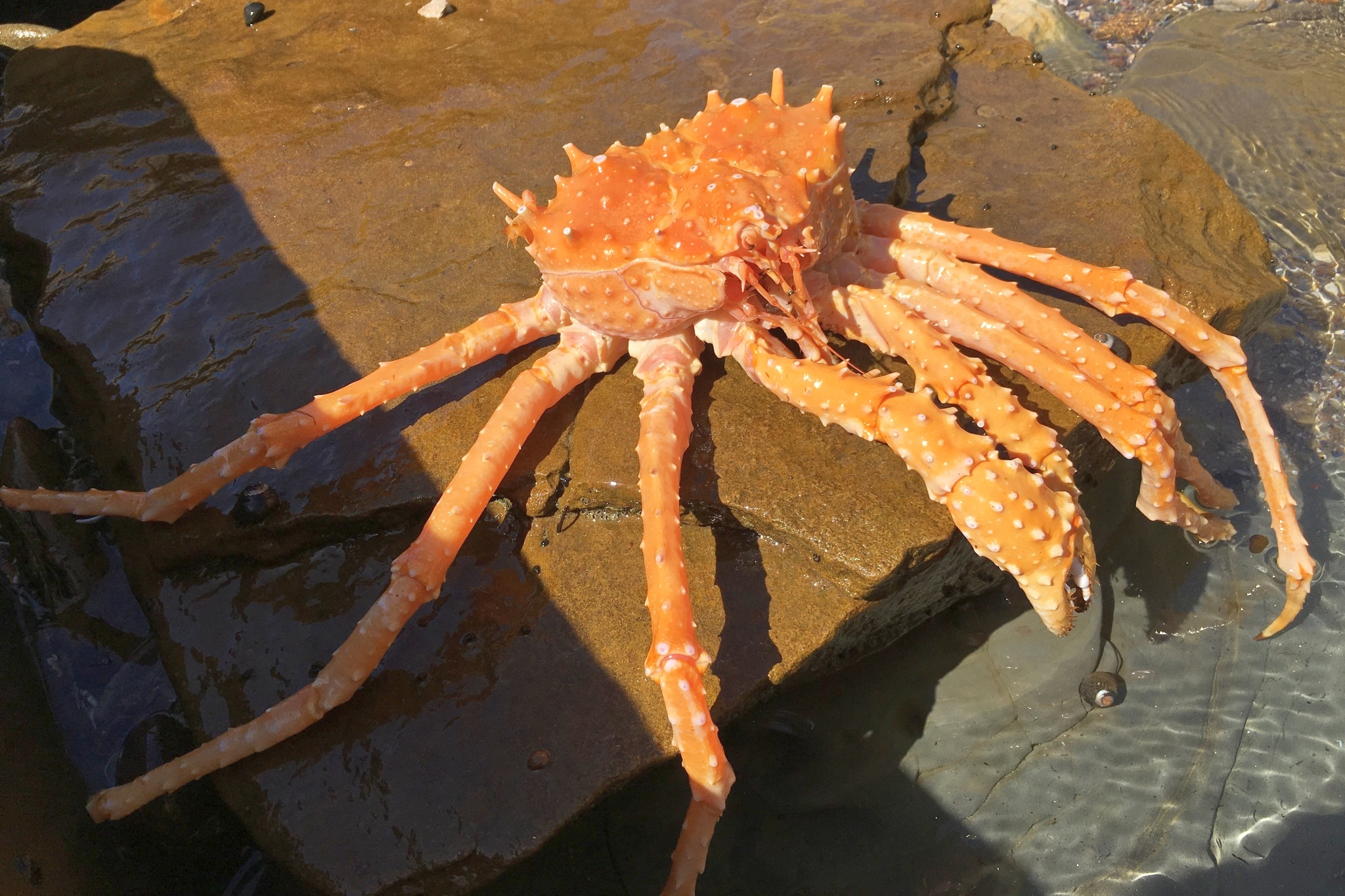 청색왕게는 북쪽 차가운 해역에 서식하는 킹크랩의 일종으로, 갑폭 15cm까지 자라고 푸른빛 보라색 갑각을 가지며 식용으로 어획되지만 개체 수 감소로 어업이 제한적으로 이루어지고 있다.