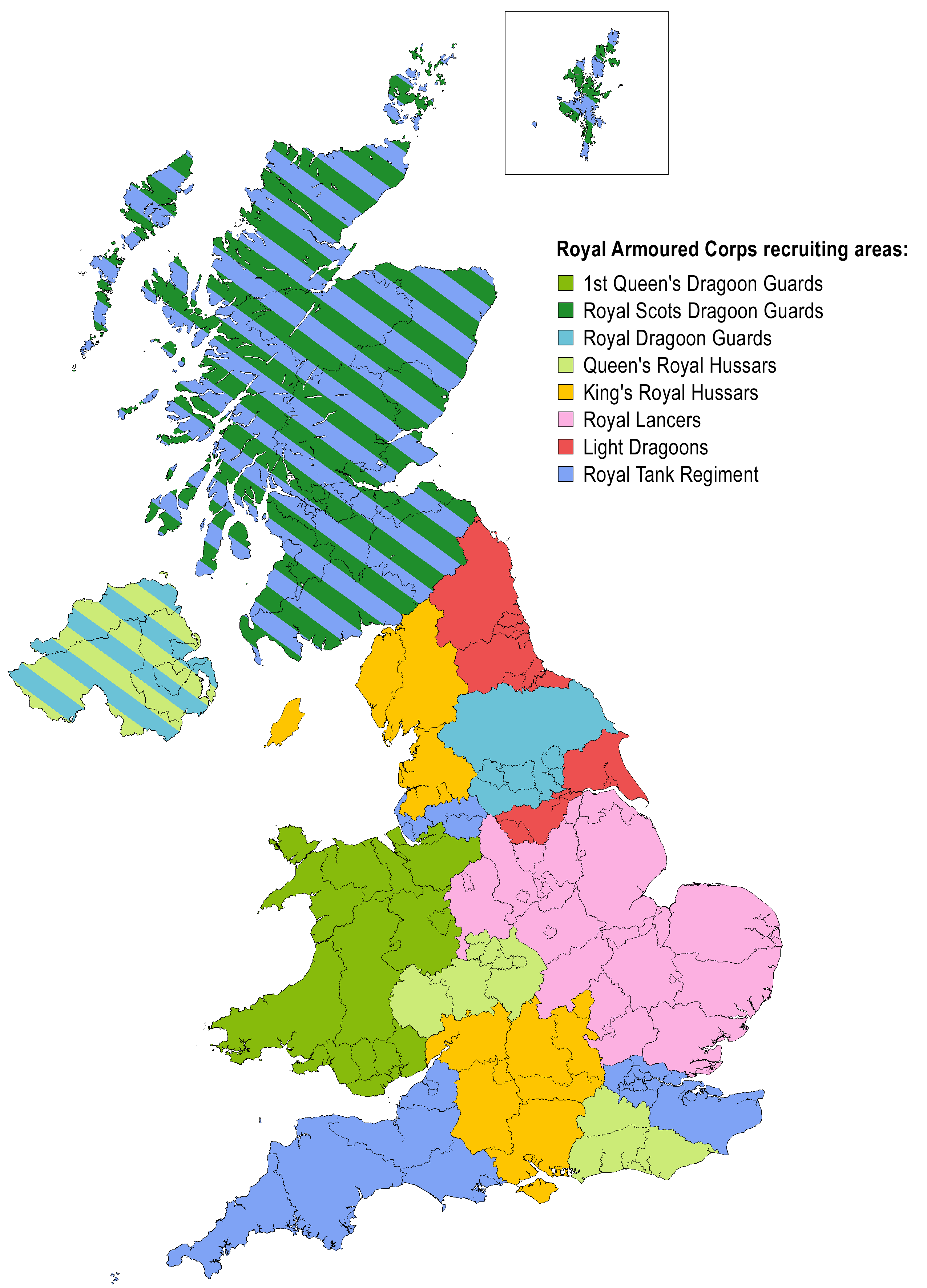 2013년 발표된 배치 계획에 따르면 모든 왕립 기갑 군단 연대는 영국에 주둔한다.[19]기갑 연대