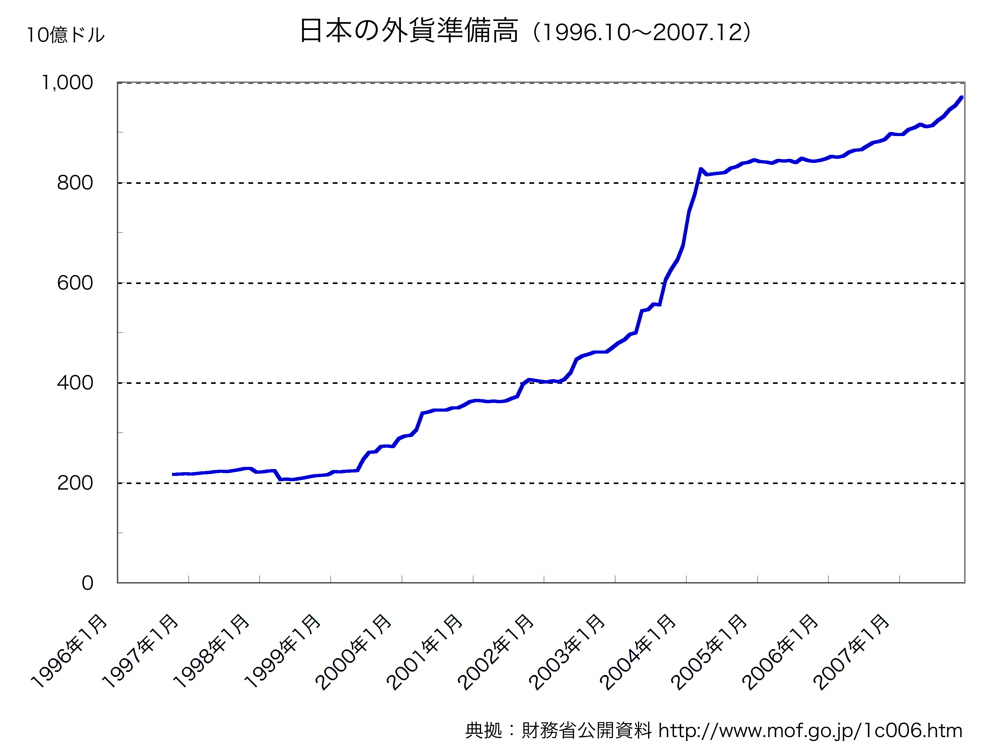 일본은 2003년부터 2004년에 걸쳐 미조구치 젠베이 재무관 주도로 달러 매입 환율 개입(''테일러·미조구치 개입'')을 실시하여 달러화 외환보유고가 급증했다. 일본 정부는 외환보유고 운용 방법을 공개하지 않지만, 대부분 미국 국채로 운용되고 있다고 알려져 있다.[29]