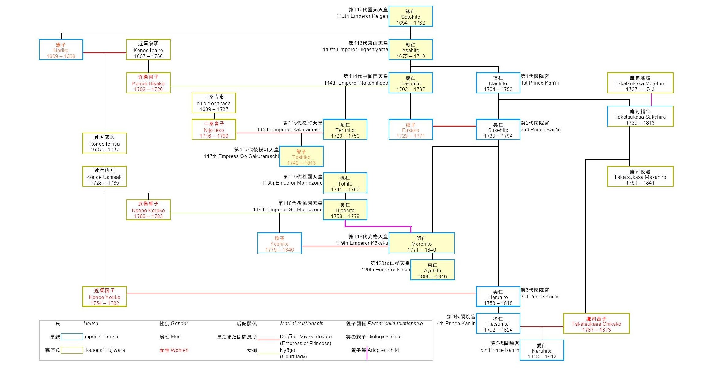남편이자 양오빠 | 고카쿠 천황 | 1771년 9월 23일 | 1840년 12월 11일 | 일본 제119대 천황, 요시코의 생물학적 남성 계통의 5촌 당숙 |