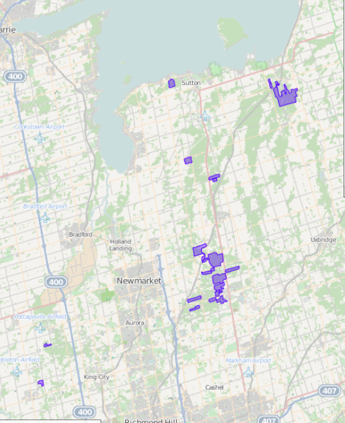 휘트처치 타운십은 스토빌과 합병하여 휘트처치-스토빌 타운을 형성했으며, 제안된 404번 고속도로 서쪽의 땅을 오로라, 뉴마켓, 리치먼드힐에 할양하고, 마컴 타운십에서 북쪽의 땅을 병합했다.[9] 조지나, 노스 귈림버리, 서튼 타운십은 조지나 타운십으로 합병되었고, 이스트 귈림버리의 이스트 귈림버리 하이츠 지역은 뉴마켓으로 합병되었다.[9] 킹은 새로운 지역의 북서쪽 부분을 형성했지만, 배서스트 스트리트에서 영 스트리트까지의 동쪽 구획은 뉴마켓, 오로라, 그리고 리치먼드힐의 일부가 된 오크 리지스에 할양되었다.[9] 오로라와 뉴마켓 사이의 경계는 세인트 존스 사이드로, 뉴마켓의 북쪽 경계는 그린 레인으로 정의되었다.[9]