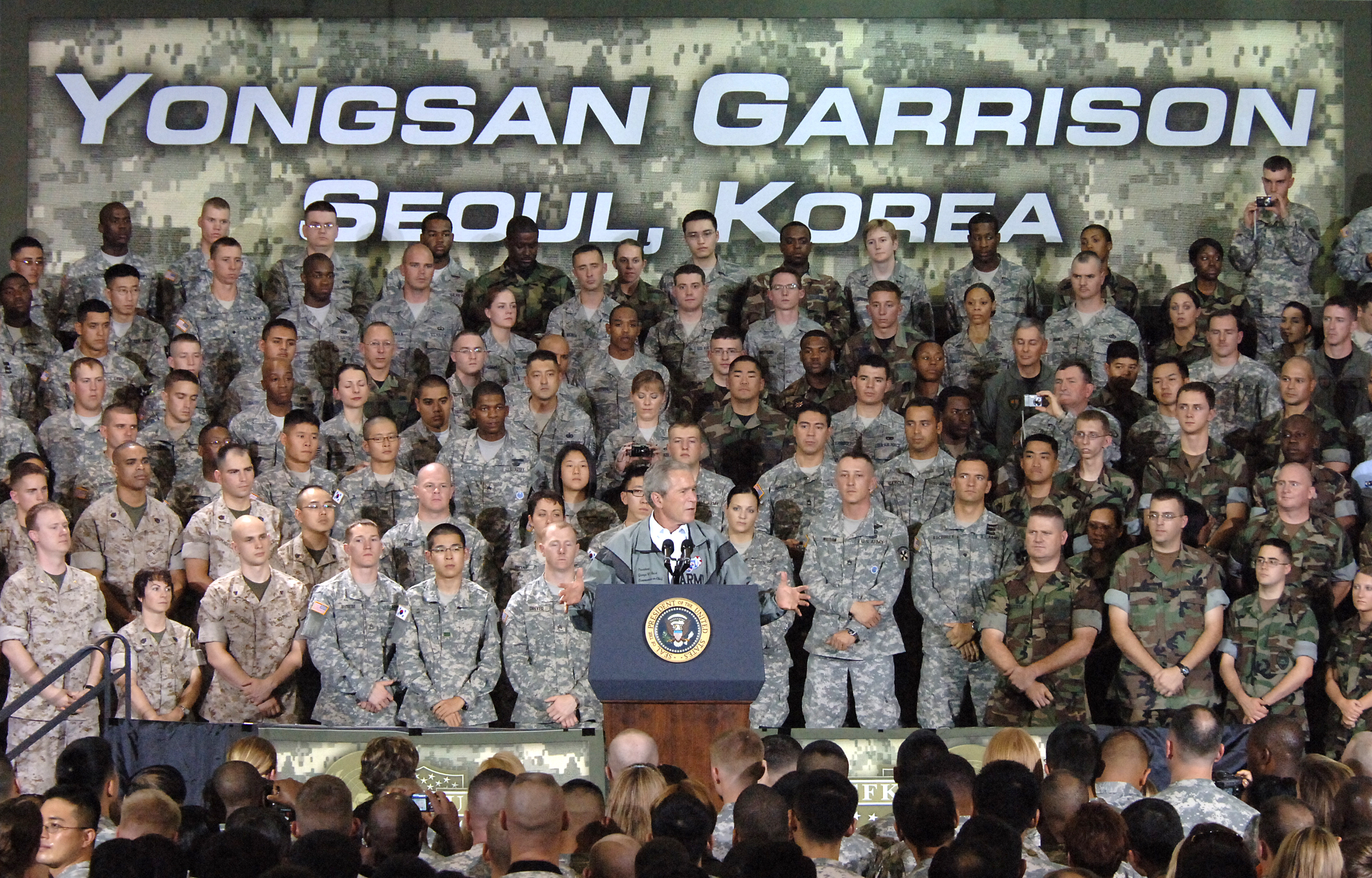 2008년 8월, 조지 W. 부시 미국 대통령은 아시아 마지막 방문의 일환으로 용산 기지의 콜리어 필드 하우스에서 주한미군 및 한국군 장병, 가족, 민간 직원들에게 연설했다.[23][32] 부시 대통령은 연설에서 "이 한반도에서 총성이 멎고 휴전 협정이 체결된 지 55년이 지났고, 그 이후로 우리 군대는 평화를 유지해 왔습니다. 우리 두 나라는 강력한 동맹을 구축했습니다."라고 말했다.[23] 그는 또한 미국은 한국에 군대를 계속 주둔시키는 한편 일부 기지를 한국에 반환할 것이라고 말했다.[32]