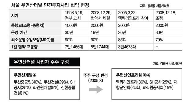 2011년 12월, 강희용 서울시의원은 시정질문을 통해 맥쿼리 인프라가 지분을 인수한 우면산터널의 협약이 민간 사업자에게 유리하게 변경되었다는 특혜 의혹을 제기했다. 운영 기간은 19년에서 30년으로, 운영 비용은 1059억 원에서 1507억 원으로 상향 조정됨에 따라 협약 통행료 수입이 3796억 원이 늘었다는 주장이었다. 이에 대해 서울시는 최소운영수입보장(MRG) 비율을 5% 낮추고 1일 협약 교통량을 낮췄기 때문에 특혜가 아니라고 반박했다. 그러나 협약 교통량을 줄였음에도 불구하고 운영 비용을 466억 원 추가로 보전해준 부분이 문제점으로 지적되었다.강희용 의원은 이와 관련해 서울시가 민간 사업자에게 협약 내용을 유리하게 바꾼 시점이 이명박 서울시장과 연관이 있던 점을 비판했다. 2003년 11월, 맥쿼리 계열사에 이상득 의원의 아들 이지형 씨가 취임하고, 12월 맥쿼리한국인프라가 우면산개발의 지분을 매입해 최대 주주가 교체되었다. 예상 수입에 미달할 시 서울시가 보전해야 하는 최소운영수입보장(MRG)을 체결한 경우는 지하철 9호선과 우면산 터널 두 곳뿐이다.