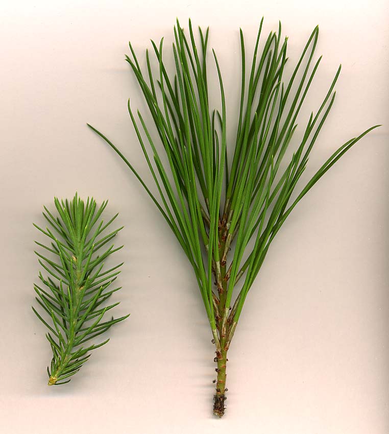 잎은 두 종류가 있다. 성숙한 나무의 잎은 두 개씩 묶여 나며, 길이는 10cm에서 20cm 정도이고 예외적으로 30cm까지 자라기도 한다. 이 잎은 탄력 있고 뾰족하며 녹색을 띤다. 반면, 5년에서 10년생 정도까지의 어린 나무에서는 다른 형태의 잎이 나는데, 이를 유묘 잎이라고 한다. 유묘 잎은 하나씩 나며 길이는 2cm에서 4cm 정도로 짧고, 청록색 또는 회청색을 띤다. 나무가 4~5년생이 되면 성숙한 잎이 유묘 잎과 섞여 나기 시작하며, 약 10년생이 되면 완전히 성숙한 잎으로 대체된다. 다 자란 나무라도 가지가 부러지는 등의 손상을 입으면 새로 돋아나는 순에서는 어린잎 형태가 다시 나타날 수 있다.
