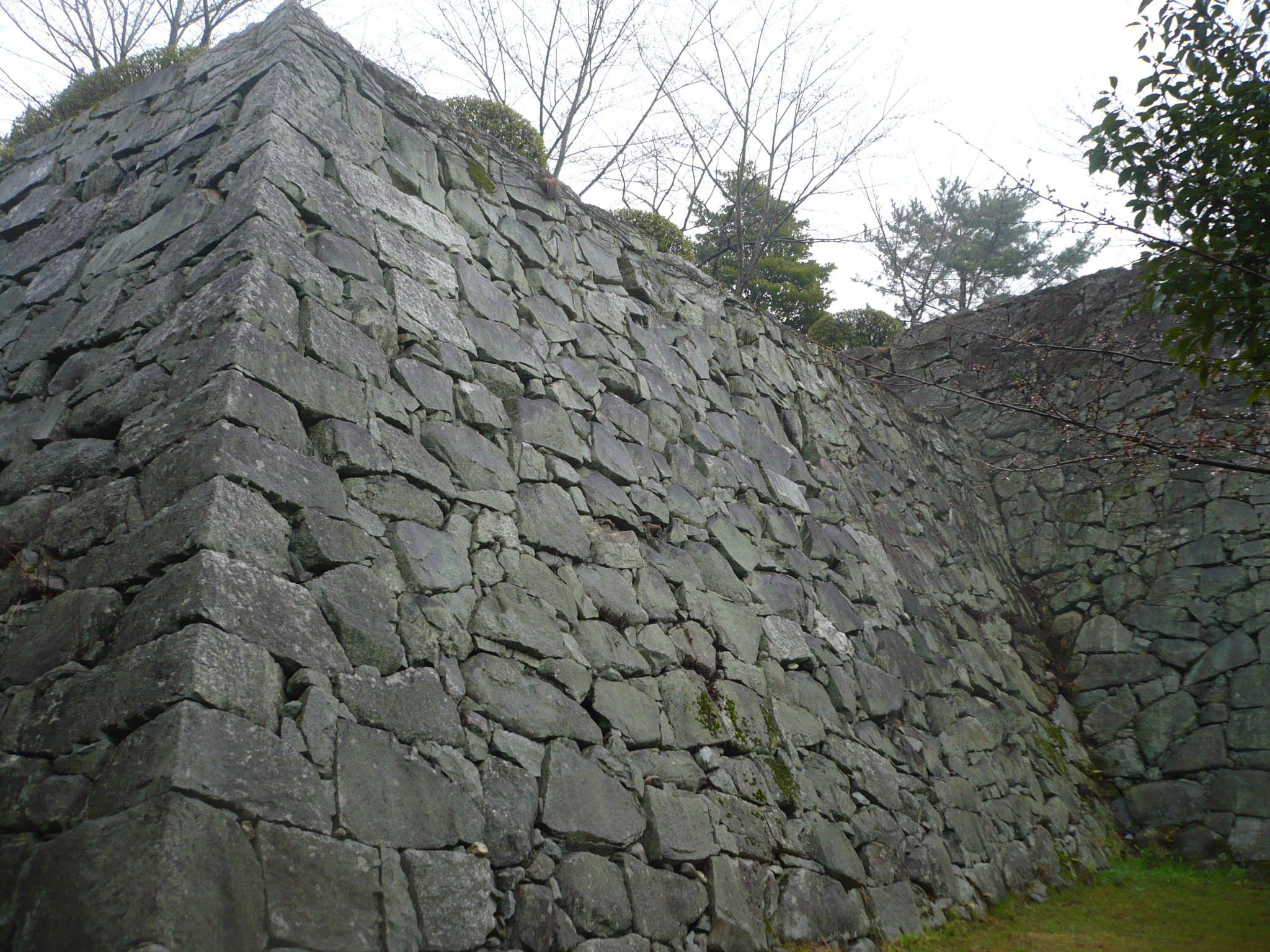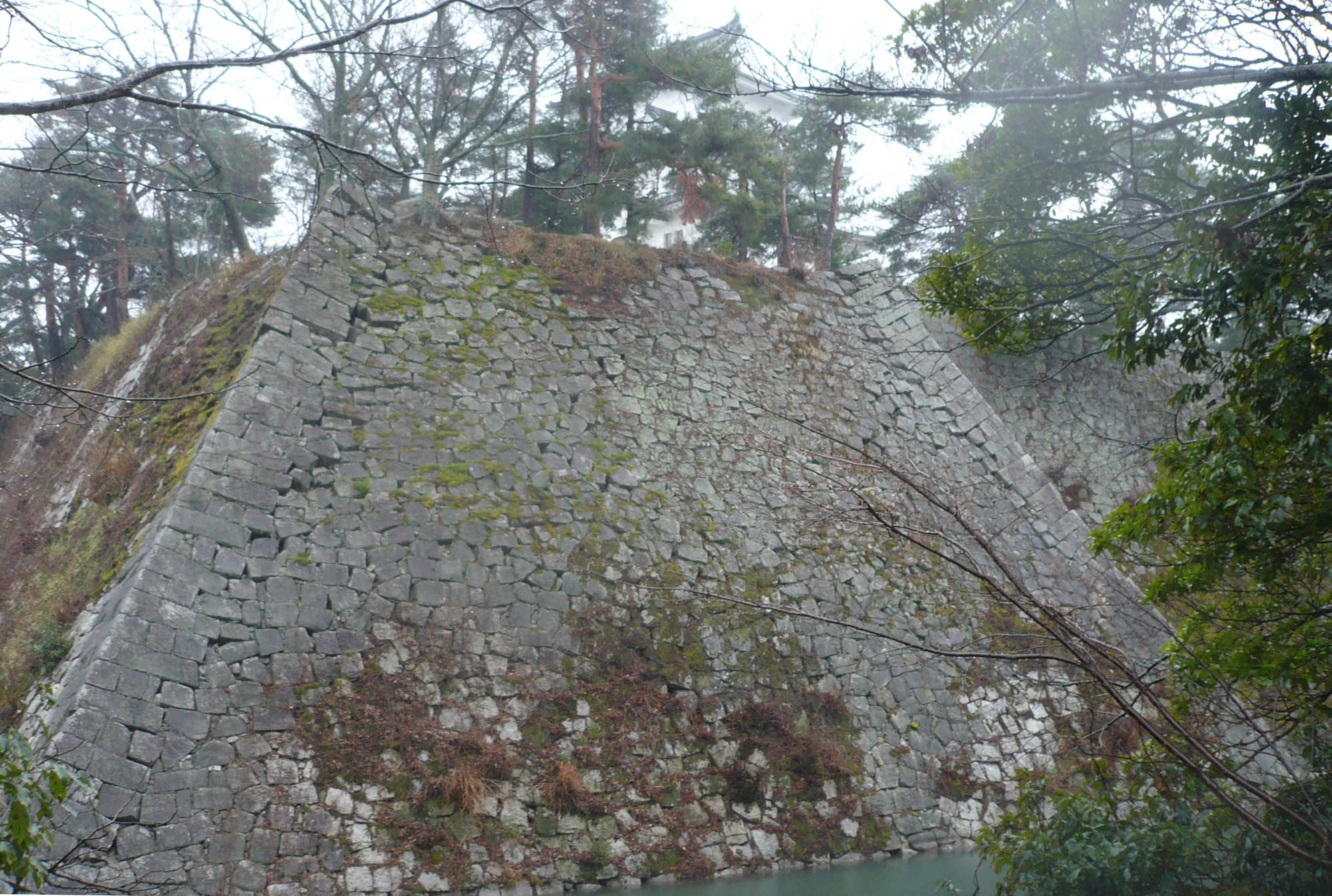1611년(게이초 16년) 도도 다카토라가 "깎아지른 듯한 석축 쌓기" 기법으로 축조한 높은 성벽은 오사카성의 높은 석축과 함께 일본에서 손꼽힌다. 근석에서 천단까지 높이는 약 29.7m이며, 삼면으로 꺾어 368m에 이른다.[2]
