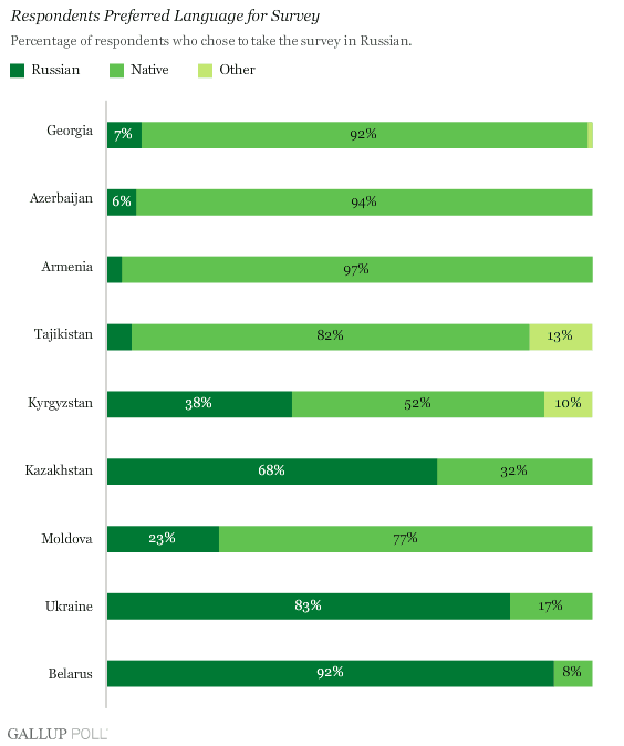 2008년 초 갤럽 연구소의 연구에 따르면, 우크라이나 시민의 83%가 러시아어로 설문지를 작성하는 것을 선택했다.[13] 설문지는 러시아어, 우크라이나어, 영어 세 가지 버전으로 제공되었으며, 언어 관련 주제가 아니었기에 응답자의 민족적 또는 이념적 정체성과는 무관하게 언어 선호도를 보여주는 결과로 해석될 수 있다.