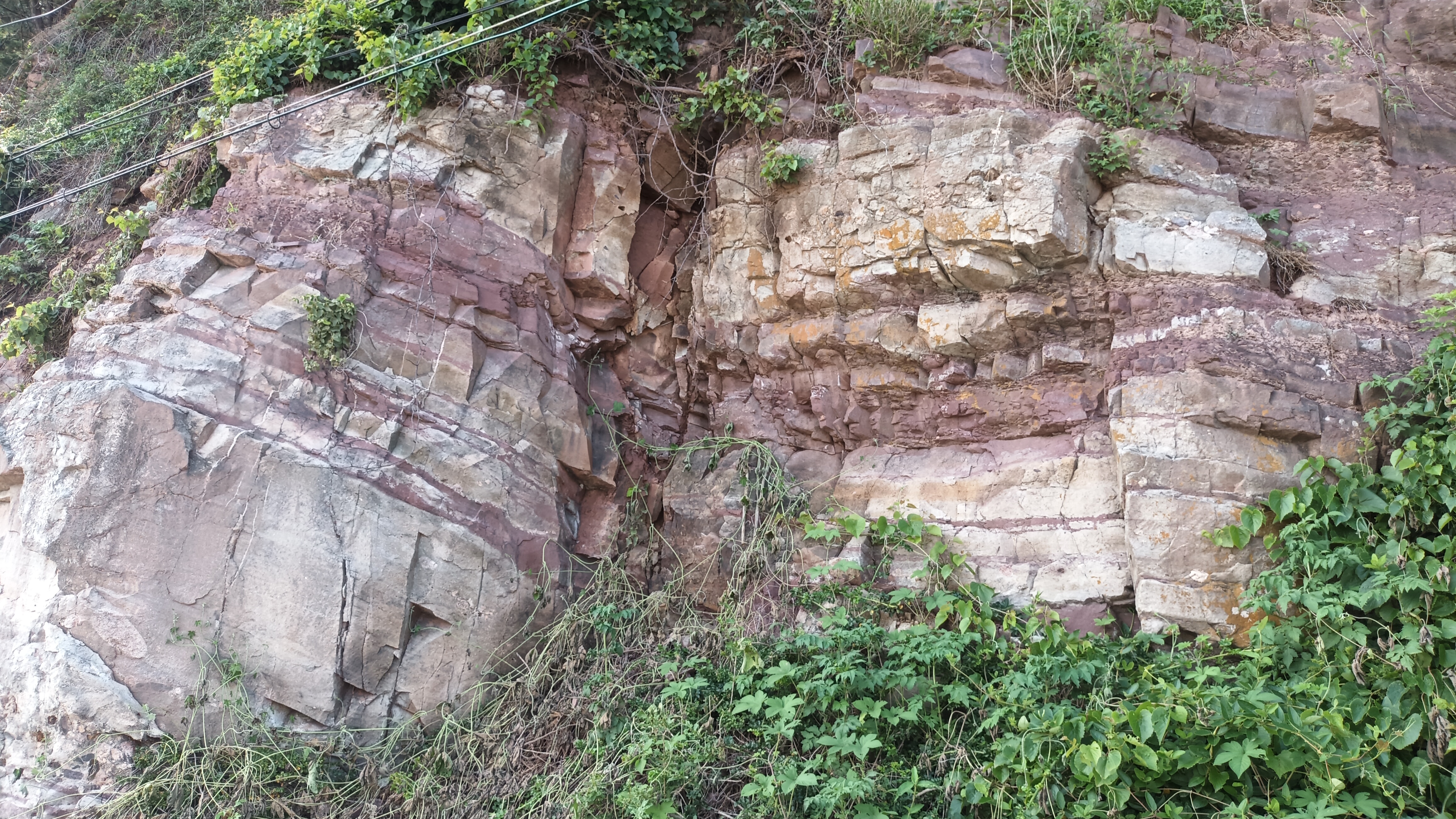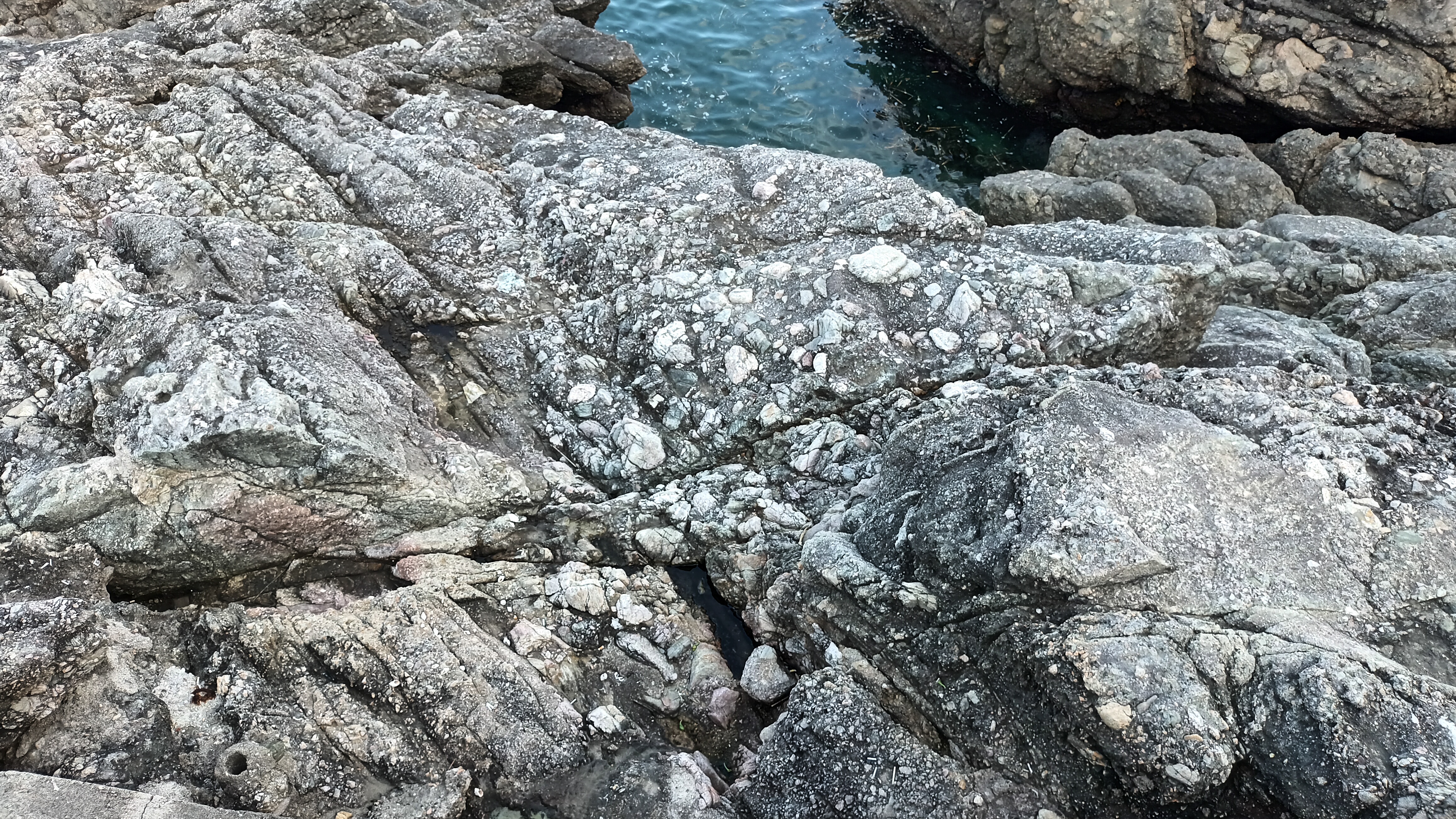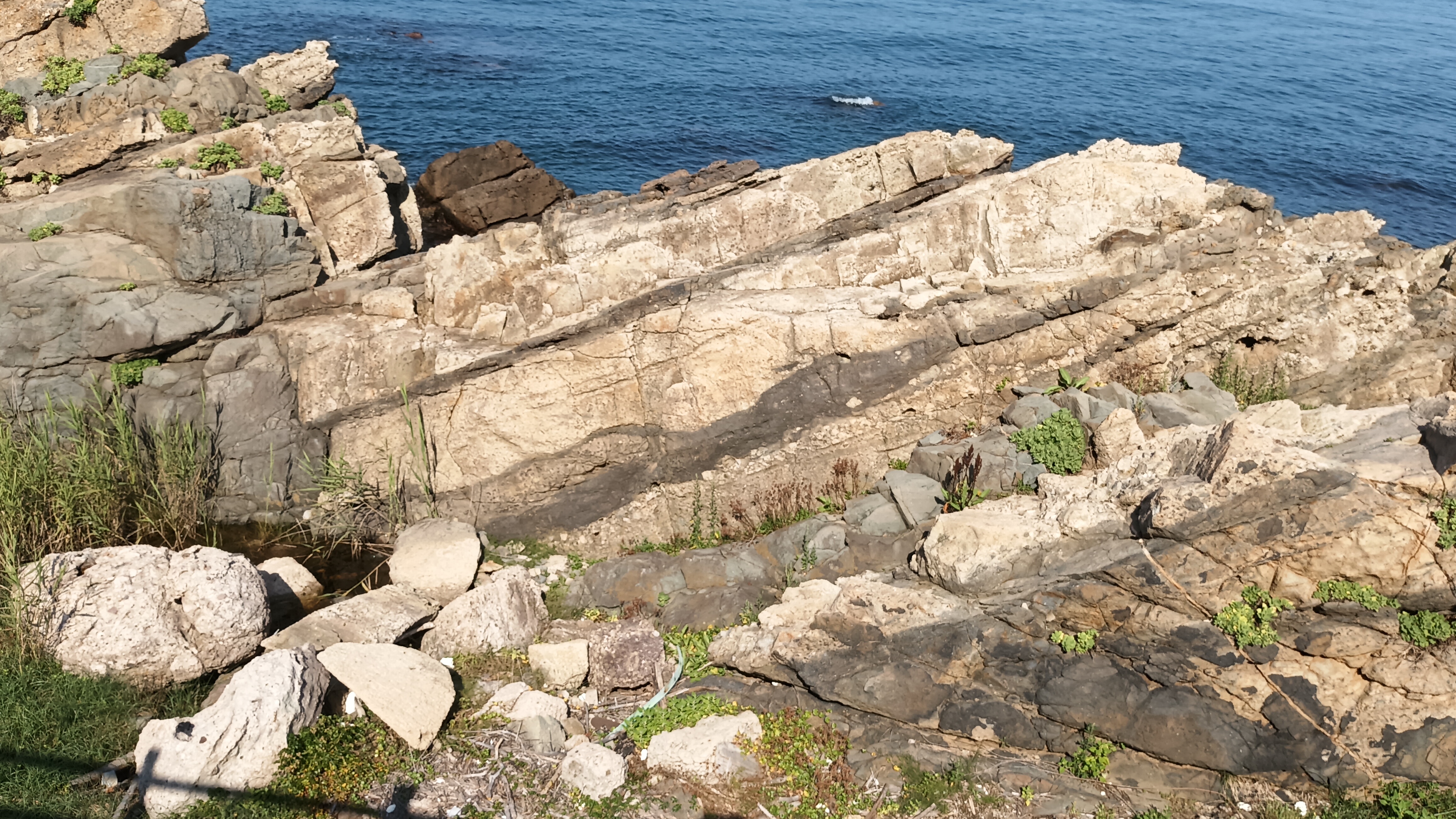 죽도산 퇴적암 | 축산면 축산리 | 점이 층리, 판상 층리, 사층리 발달, 중성암맥 관입, 페퍼라이트 관찰 |