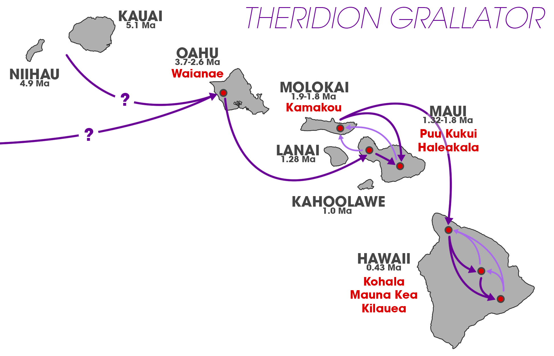 마우이섬과 하와이섬의 ''T. grallator'' 색깔 형질의 유전적 배경이 다른 이유는 두 섬의 나이와 정착의 차이 때문이다. 마우이섬이 먼저 나타났고, 그 다음이 하와이섬이다.[8] 하와이섬에서 일부 성 선택적 형질이 존재하는 것은 진화적 압력으로 인해 유전 패턴의 변화가 발생했음을 보여준다.[14] 현재 하와이 제도 섬들 간의 개체 교환은 거의 없으며, 각 섬에서 단일 계통 분지도를 형성한다.[14] 유전적 배경의 차이와 개체의 드문 교환에도 불구하고, 섬 간의 잡종 교배는 여전히 생존 가능한 자손을 낳을 수 있다. 이는 마우이섬과 하와이섬의 ''T. grallator''가 서로 크게 분화되지 않았음을 의미한다.[14]