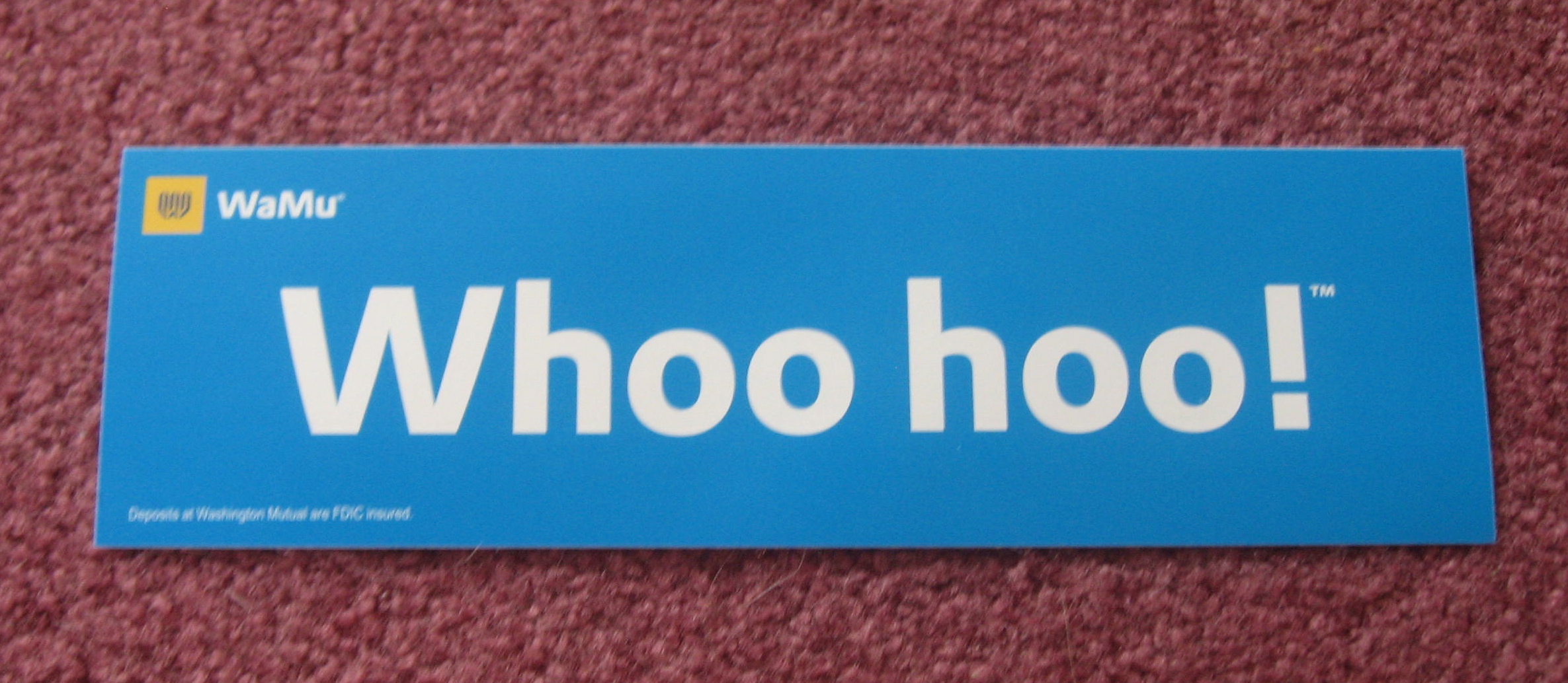 "Whoo hoo!"는 2008년 2월에 WaMu에 의해 도입된 광고 캠페인이었다. 2008년 경제 위기에 대한 우려가 커지면서, WaMu는 "사람들이 사랑하는 상징적인 브랜드"가 되기 위해 소비자들에게 다가가기 시작했고, WaMu를 소비자 친화적인 기관으로 포지셔닝하기 위한 새로운 슬로건을 만들었다.[227]