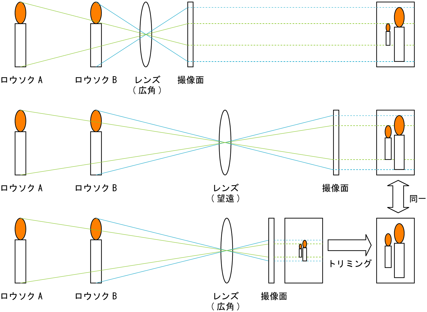 2개의 양초를 근거리와 원거리에서 촬영했을 때의 차이(양초 A와 B의 크기 비율이 다르다. 실제로는 실상이 도립된다).